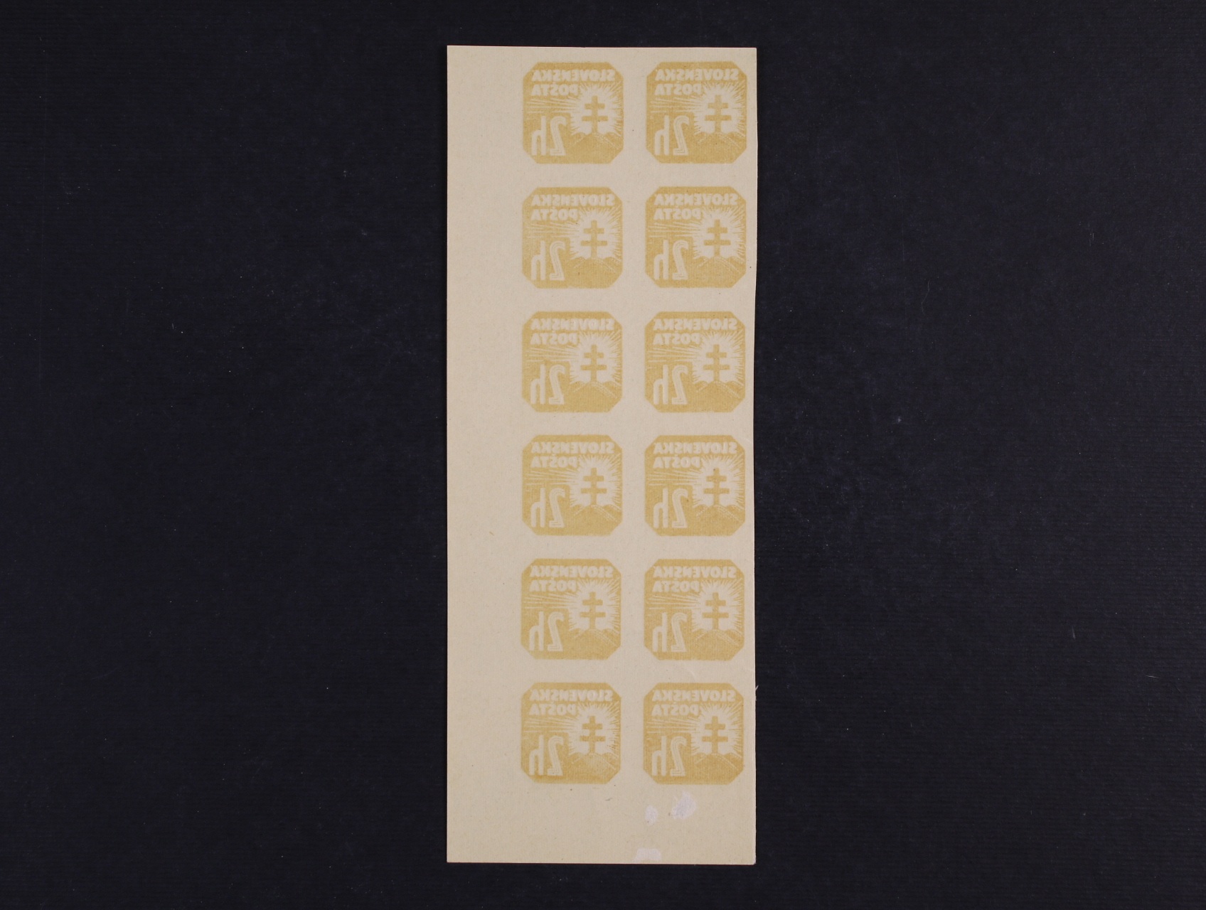 zn. NV č. 10y svislý rastr, 12ti blok se strojovým obtiskem na lepu, vada lepu na spodním okraji mimo známky, místy lehké otisky prstu