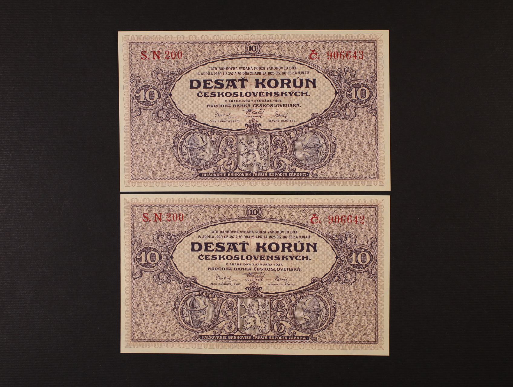 10 Kč 2.1.1927 série N 200, 2 kusy s čísly po sobě, Ba. 22e, Pi. 20a