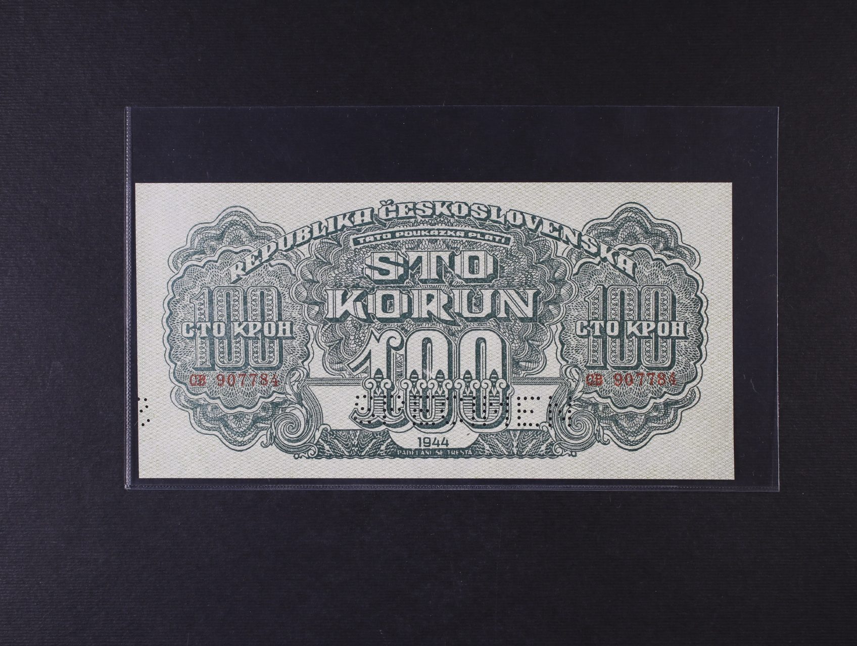 100 K 1944 série CB, číslovač 6b, s perforací SPECIMEN + část perorace "S" v levém okraji, Ba. 59a1, Pi. 48a