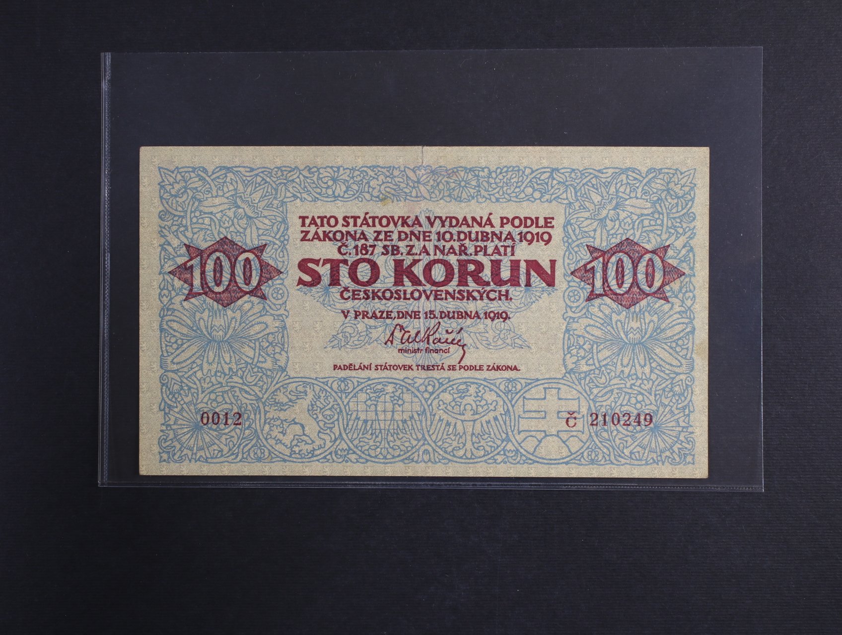• 100 Kč 15.4.1919 série 0012, Ba. 12, Pi. 11, natržena v ohybu 10 mm