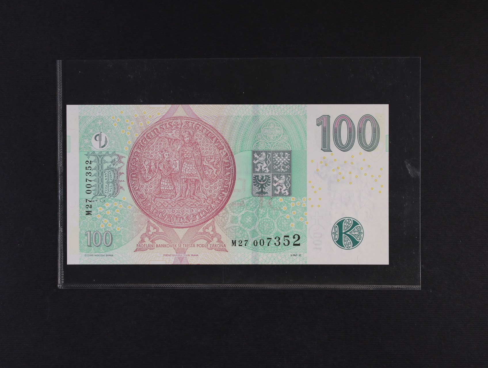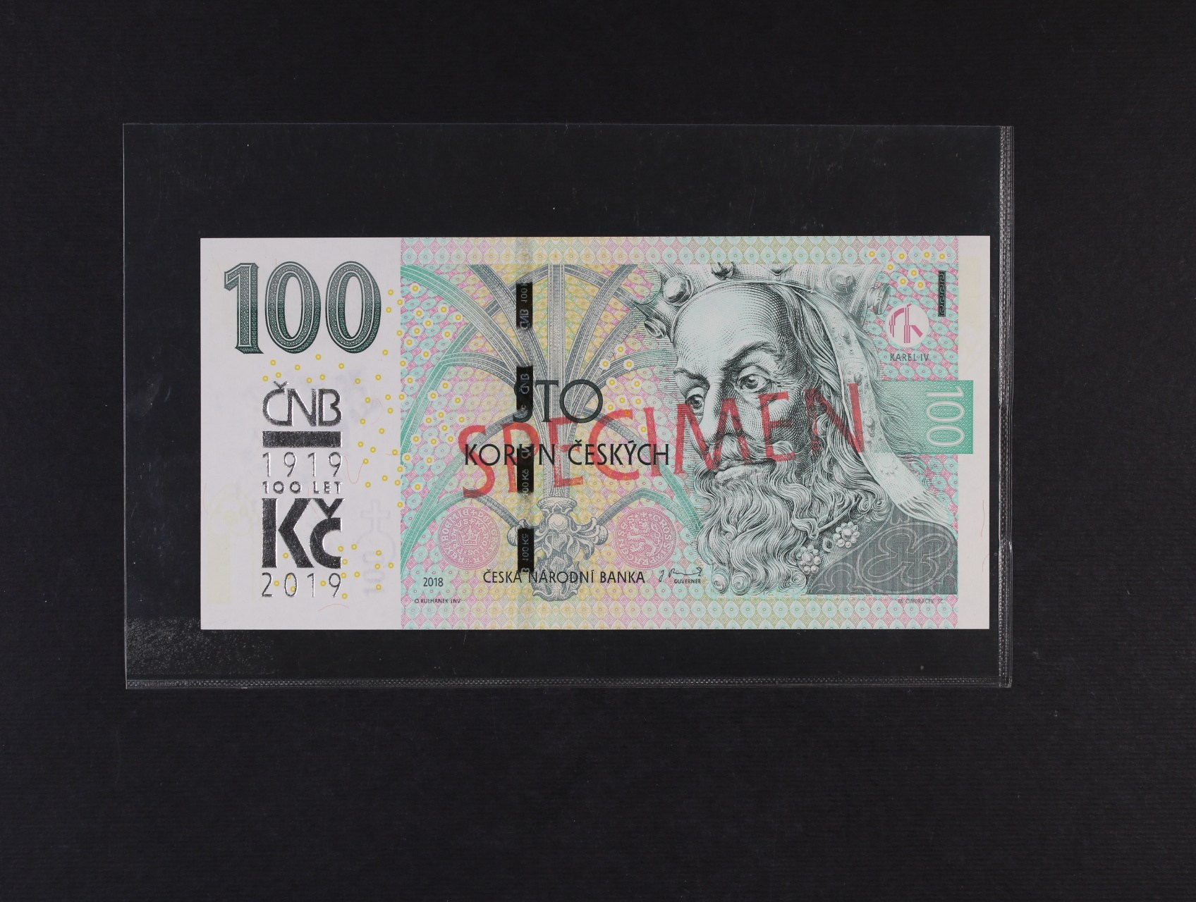 100 Kč 2019 série M 27 pamětní s přítiskem ČNB 100 LET Kč 1919 - 2019 s červeným přetiskem SPECIMEN, Ba. CZ 29s, He. CZ 33 V2, náklad 3000 ks k propagačním účelům ČNB jako součást nástěnného kalendáře