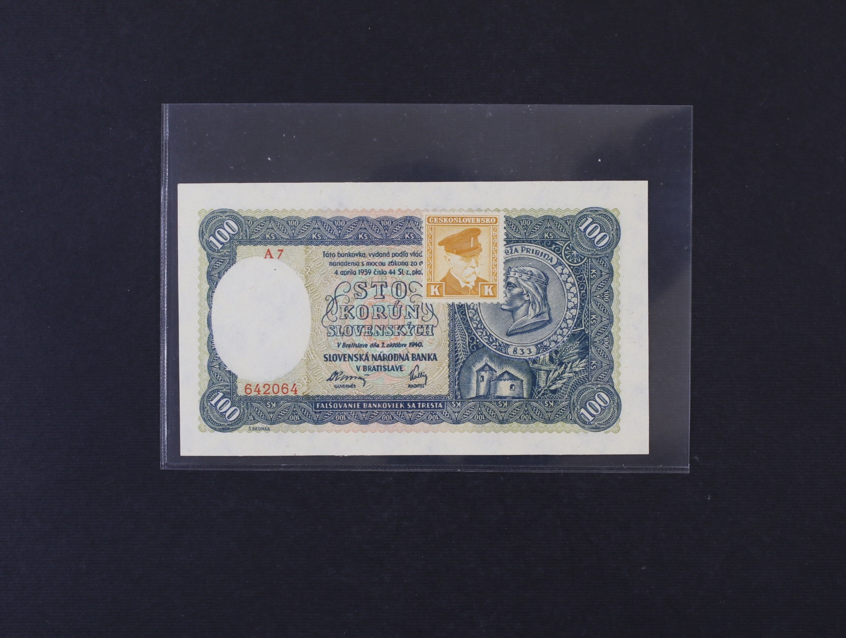 100 Ks 7.10.1940 série A 7 kolkovaná II.vydání, Ba. 63a, Pi. 52a