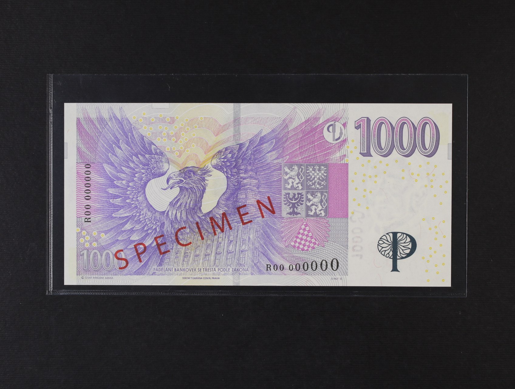 • 1000 Kč 2023 série R 00 000000 anulát s červeným  přetiskem SPECIMEN na R i A, pamětní s přítiskem ČNB 30 LET Kč 1993 - 2023