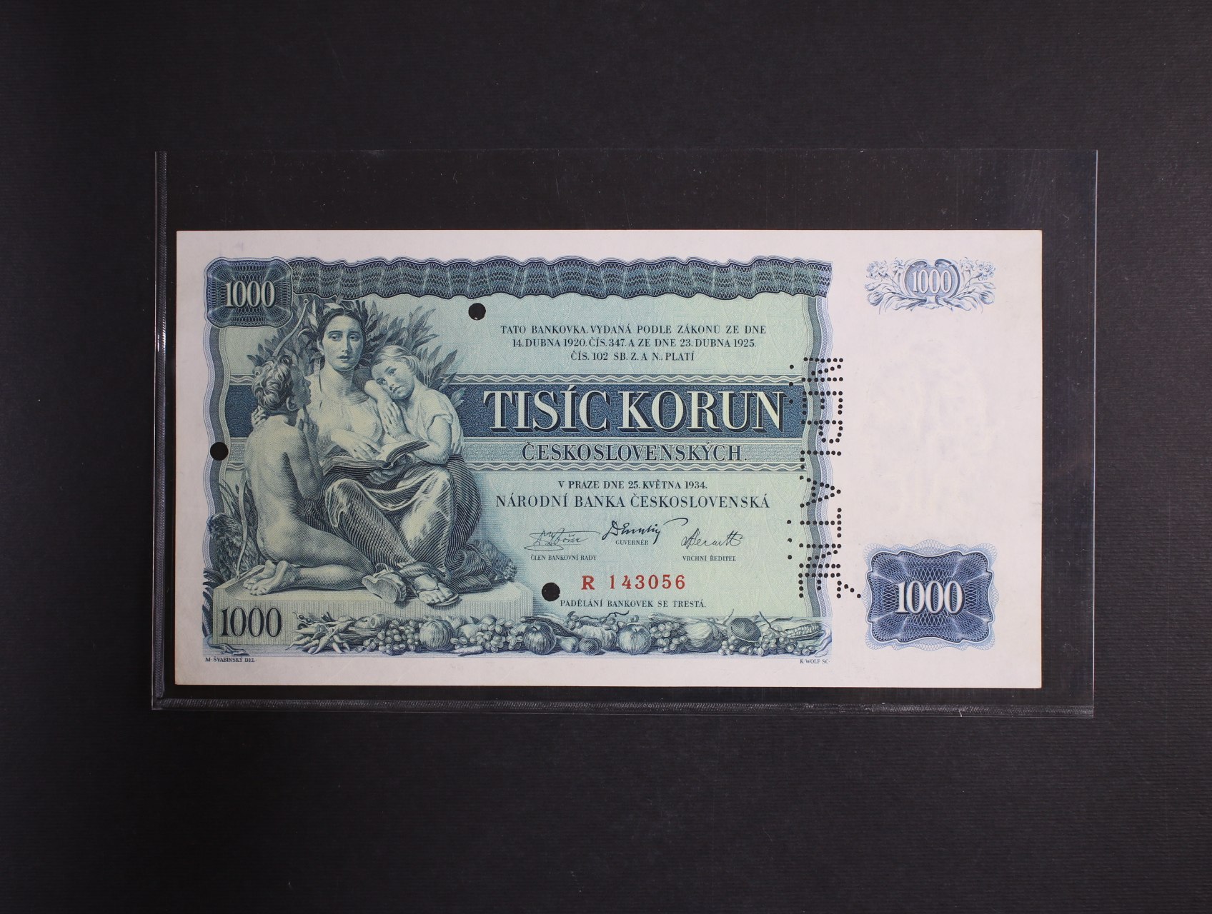 1000 Kč 25.5.1934 série R bankovní vzor se svislou perforací NEPLATNÉ + 3x perf. otvor, Ba. 27, Pi. 26s, He. 27 V5a, mimořádně vzácný