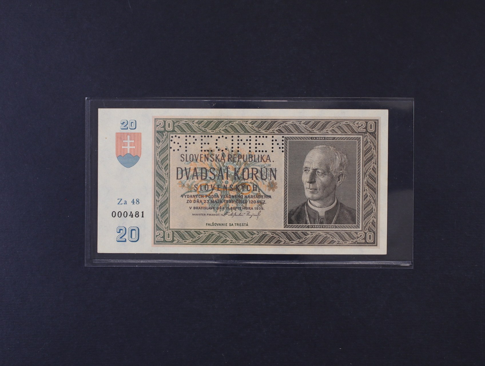• 20 Ks 15.9.1939 série Za 48 000481, bankovní vzor s perf. SPECIMEN nahoře, Ba. 47b, Pi. 5s, He. 47a2 V2