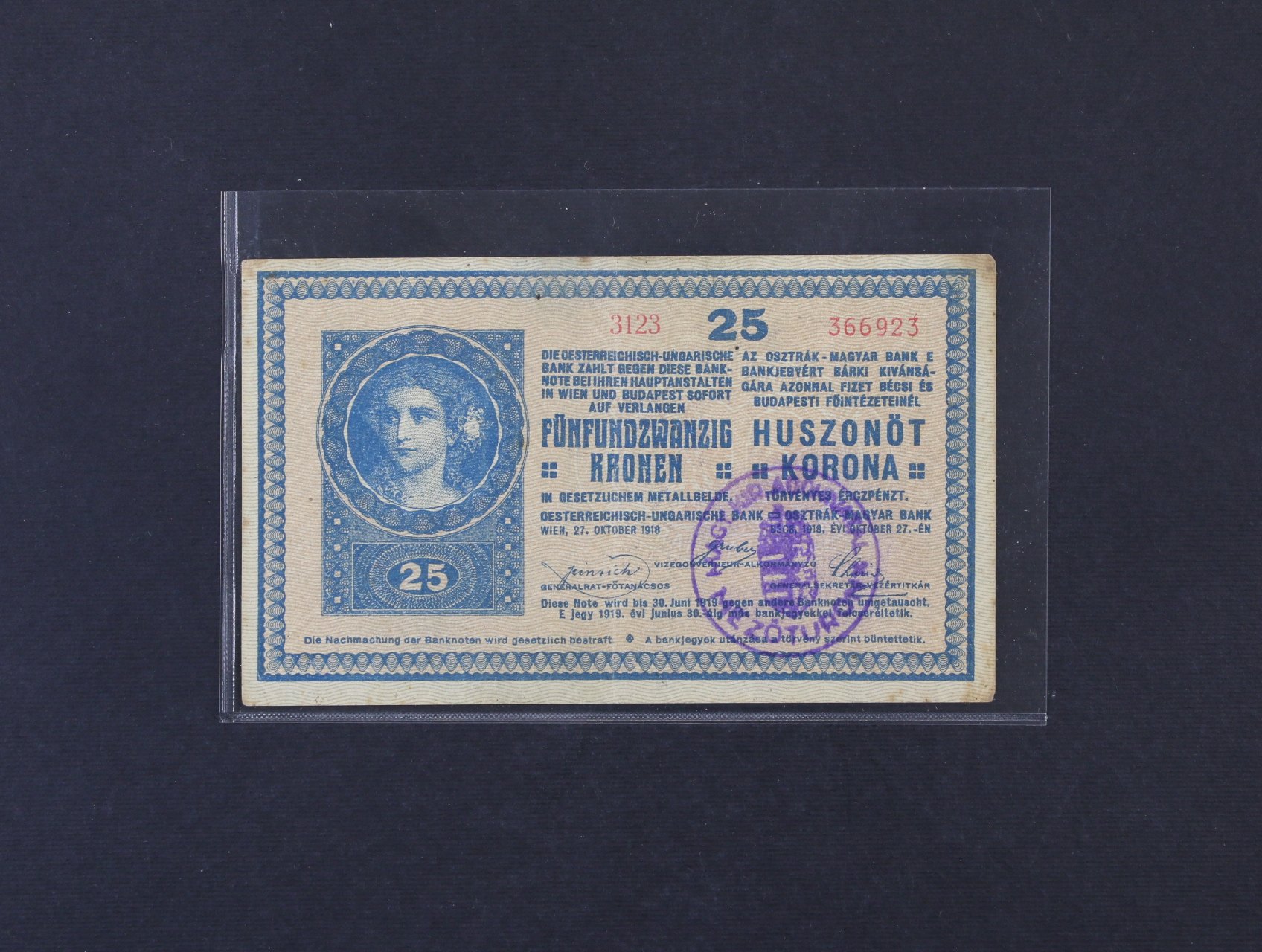 25 K 27.10.1918 série 3123 s podtiskem na R s kulatým fialovým raz. z okupace rumunského území "Magyar kir. Adóhivatal Mezöturon", Vzácnější variata číslovače He. RU17 MRRb