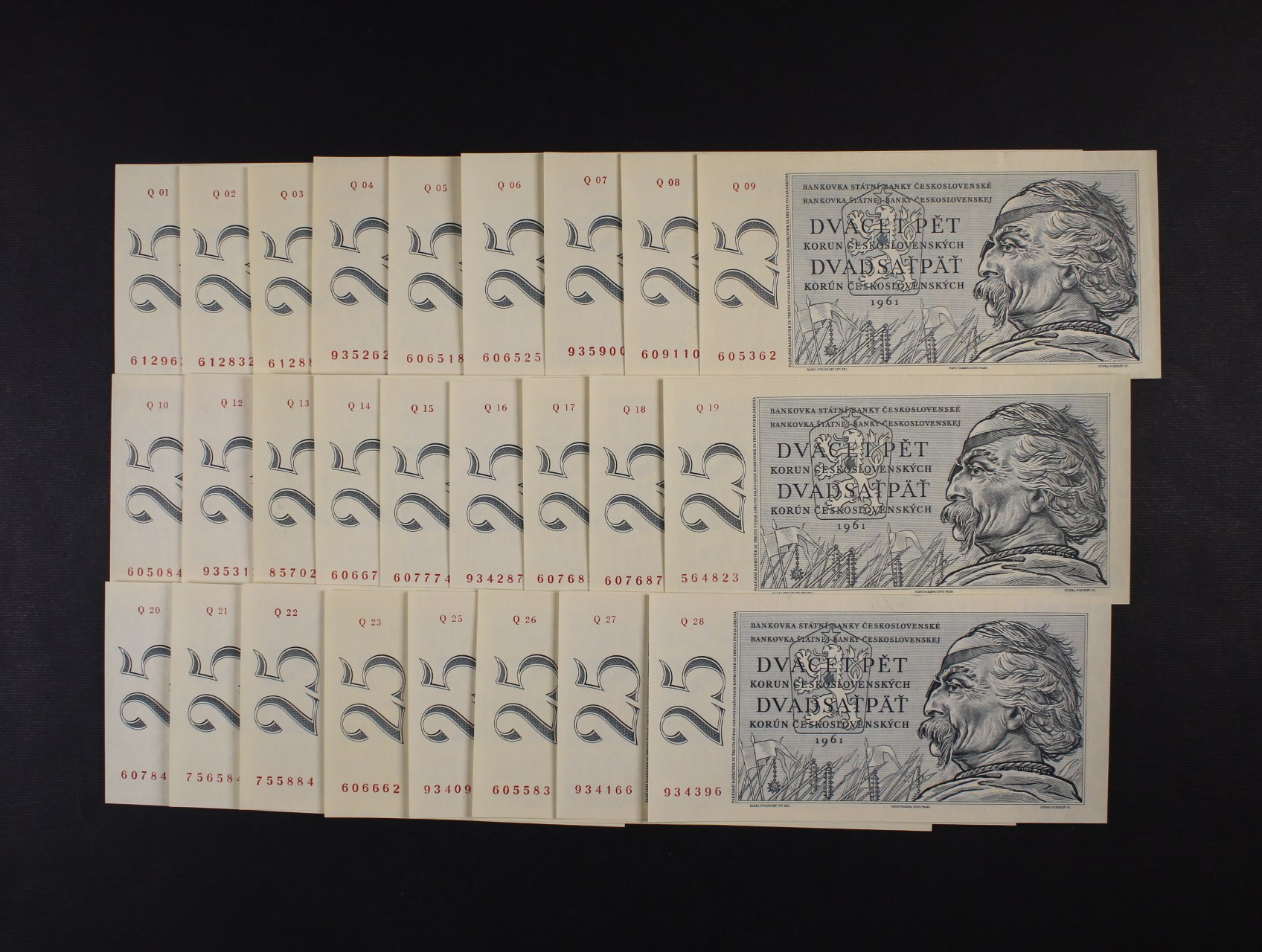 • 25 Kčs 1961 série Q 01, 02, 03, 04, 05, 06, 07, 08, 09, 10, 12, 13, 14, 15, 16, 17, 18, 19, 20, 21, 22, 23, 25, 26, 27, 28, Ba . 97b, Pi. 89a, celkem 26 kusů