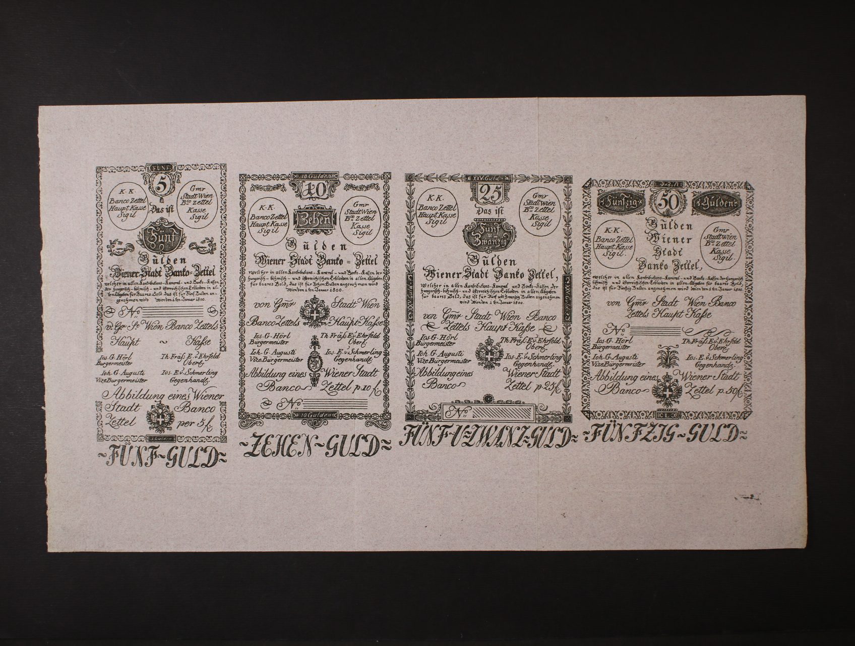 5, 10, 25, 50, 100, 500, 1000 Gulden 1.1.1800 formuláře na jednom archu bez patentu, Ri. 32 - 38 Fa