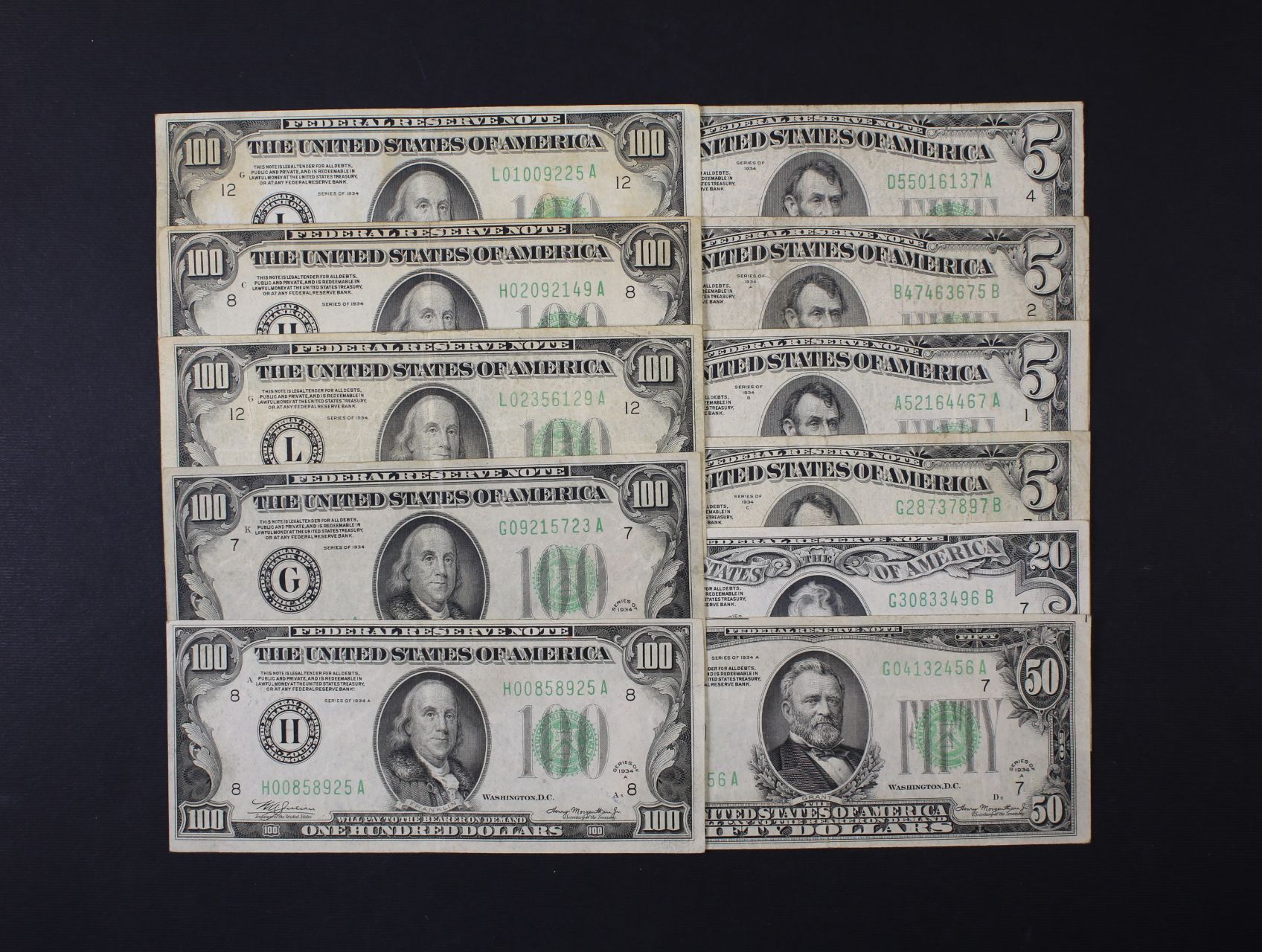 5 Dollars 1934 "D", 1934A "B", 1934B "A", 1934C "G", 20 Dollars 1934C "G", 50 Dollars 1934A "G", 100 Dollars 1934 "H", "L"(2x), "G", 1934A "H", Pi. 429D, 429Da, 429Db, 429Dc, 431Dc, 432Da, 433D, 433Da, celkem 11 kusů