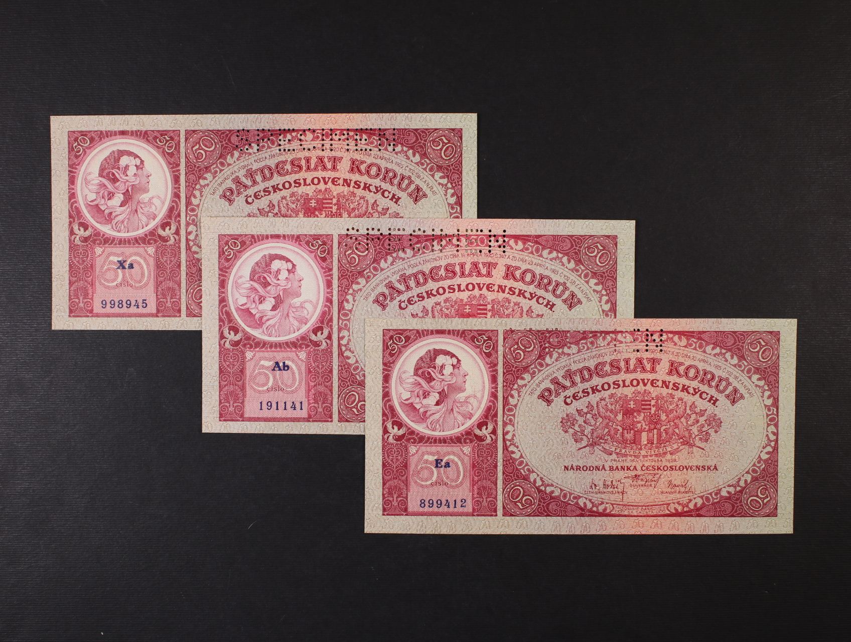• 50 Kč 1.10.1929 série Ea, Ab, Xa, vše s  perf. SPECIMEN, Ba. 24b, Pi. 22s, 3 kusy