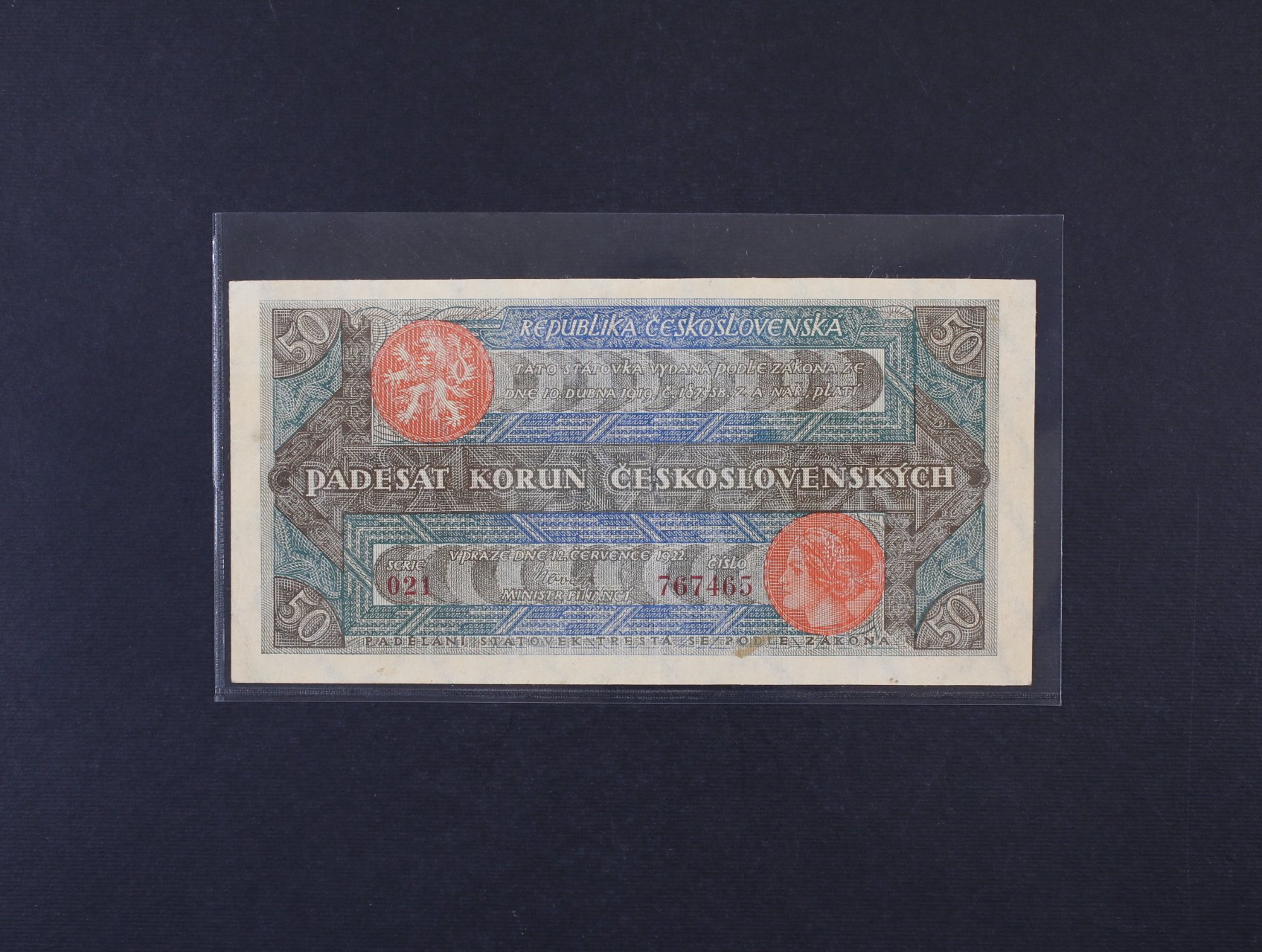 50 Kč 12.7.1922 série 021 číslovač 4d úzké číslice, Ba. 19a, Pi. 16a, ohlý roh