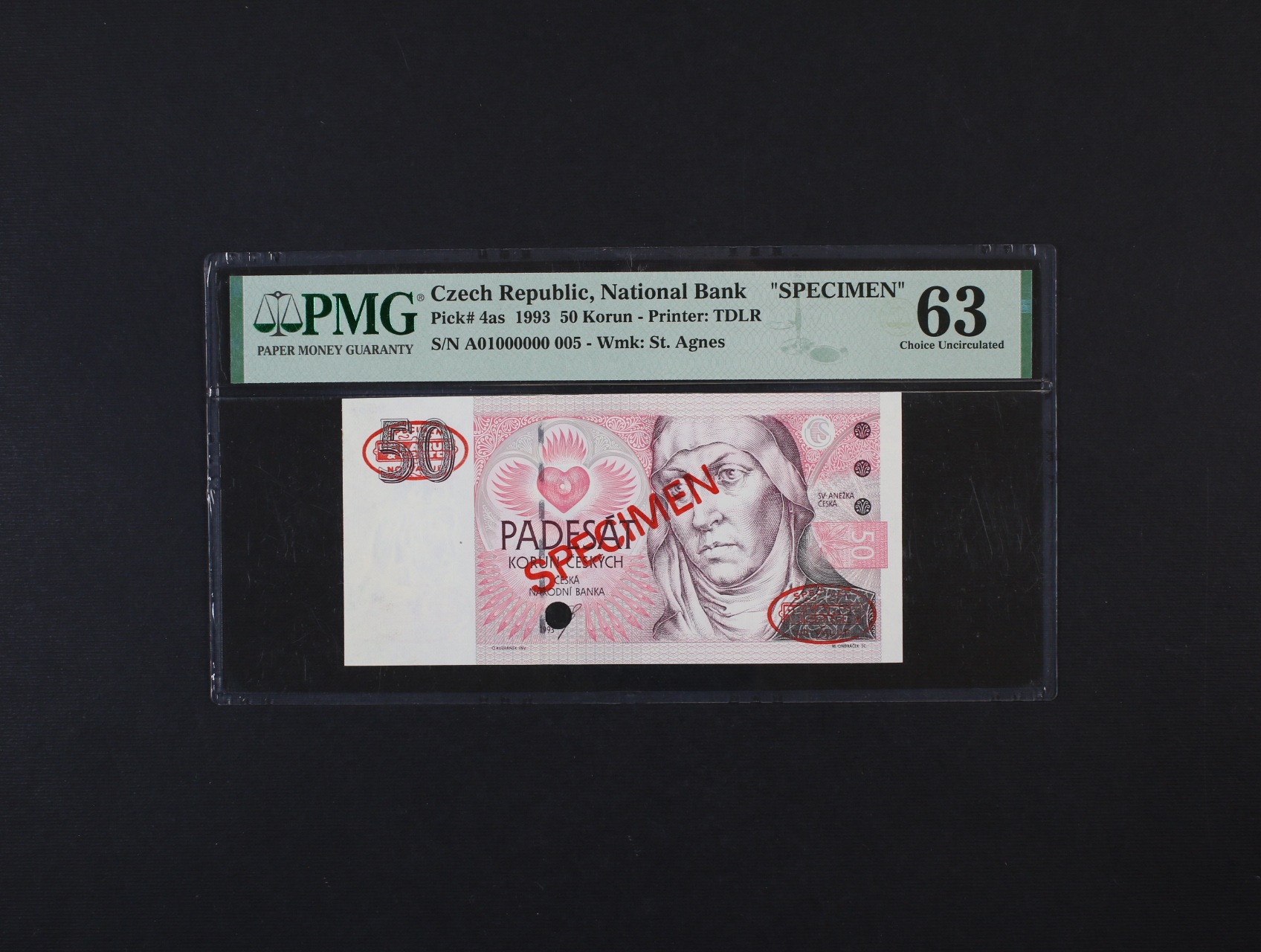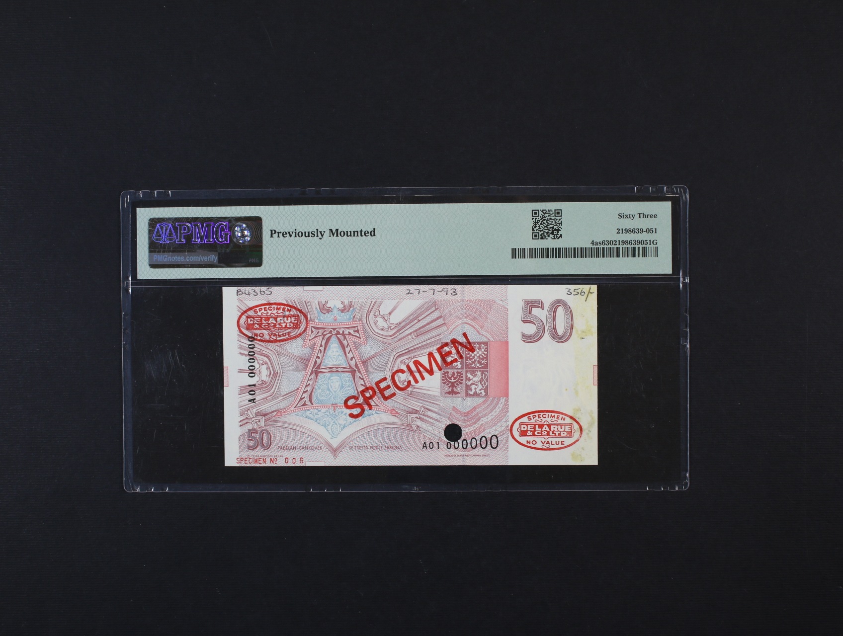 50 Kč 1993 série A 01 000000 anulát s přetiskem SPECIMEN + 2x pečeť De La Rue + perf. otvor, specimen č. 006, evidenční čísla v okraji, doposud známé pouze 3 kusy, Ba. CZ 4, Pi. 4s, He. CZ 7 V1, PMG 63, mimořádně vzácné