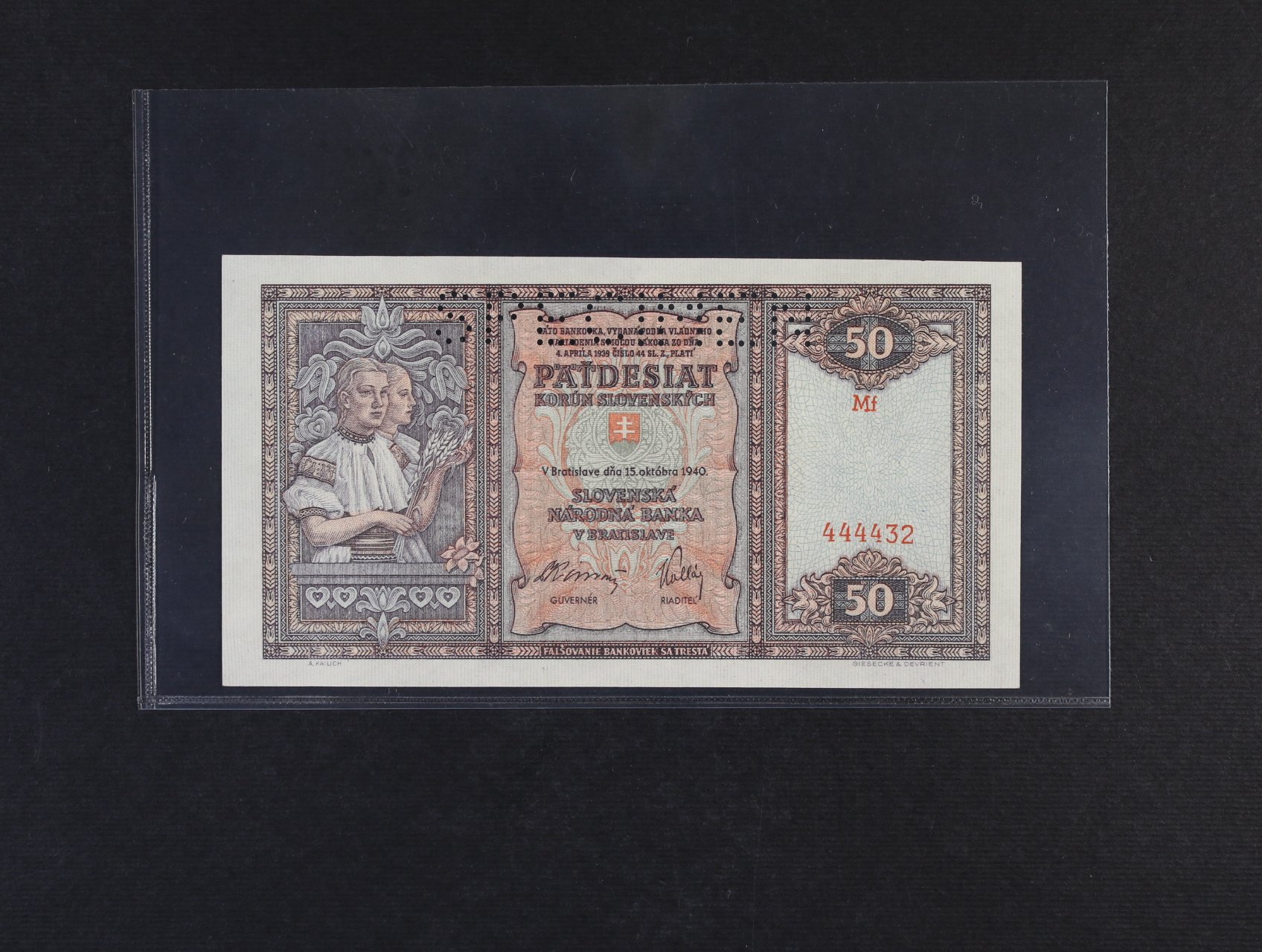 50 Ks 15.10.1940 série Mf s perf. SPECIMEN nahoře, papír se svislým rastrem - doposud neevidovaná varianta, Ba. 50, Pi. 9a
