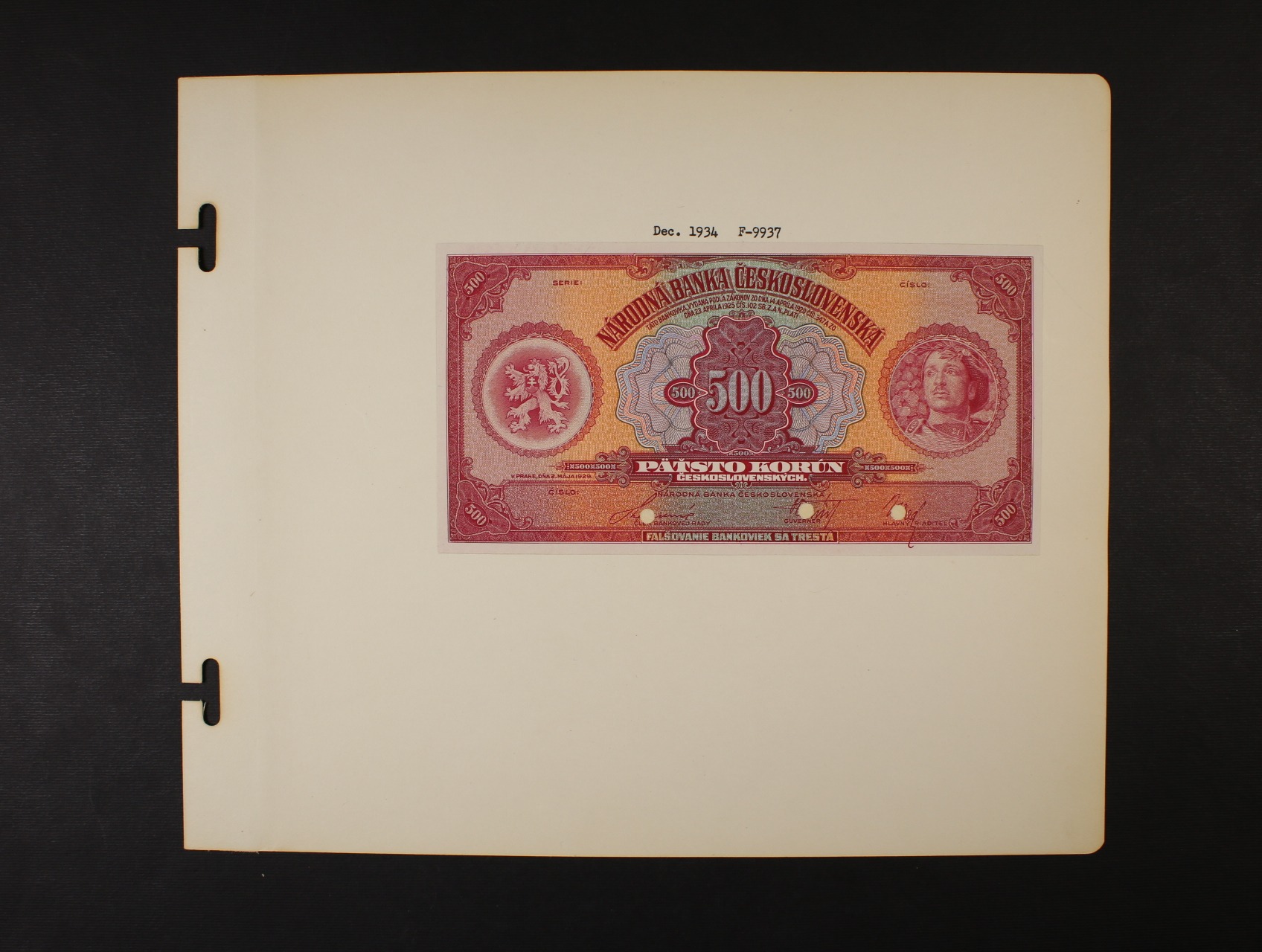 500 Kč 2.5.1929 jednostranný nátisk lícní strany z tiskárny ABNCo bez série a čísla, varianta s čárkou ve slově "MAJA", nalepené na kartonu z archivu ABNCo, Ba. 23, Pi. 24s, mimořádně vzácné