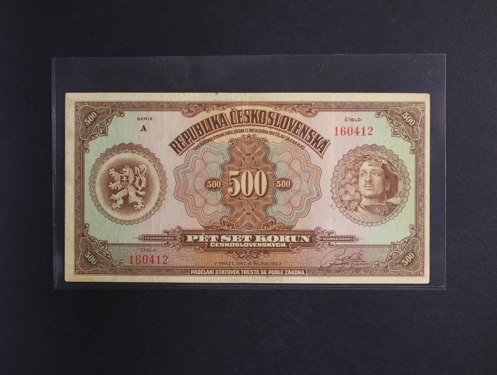 • 500 Kč 6.10.1923 série A, Ba. 20, Pi. 18a, velmi vzácná, krásná zachovalost