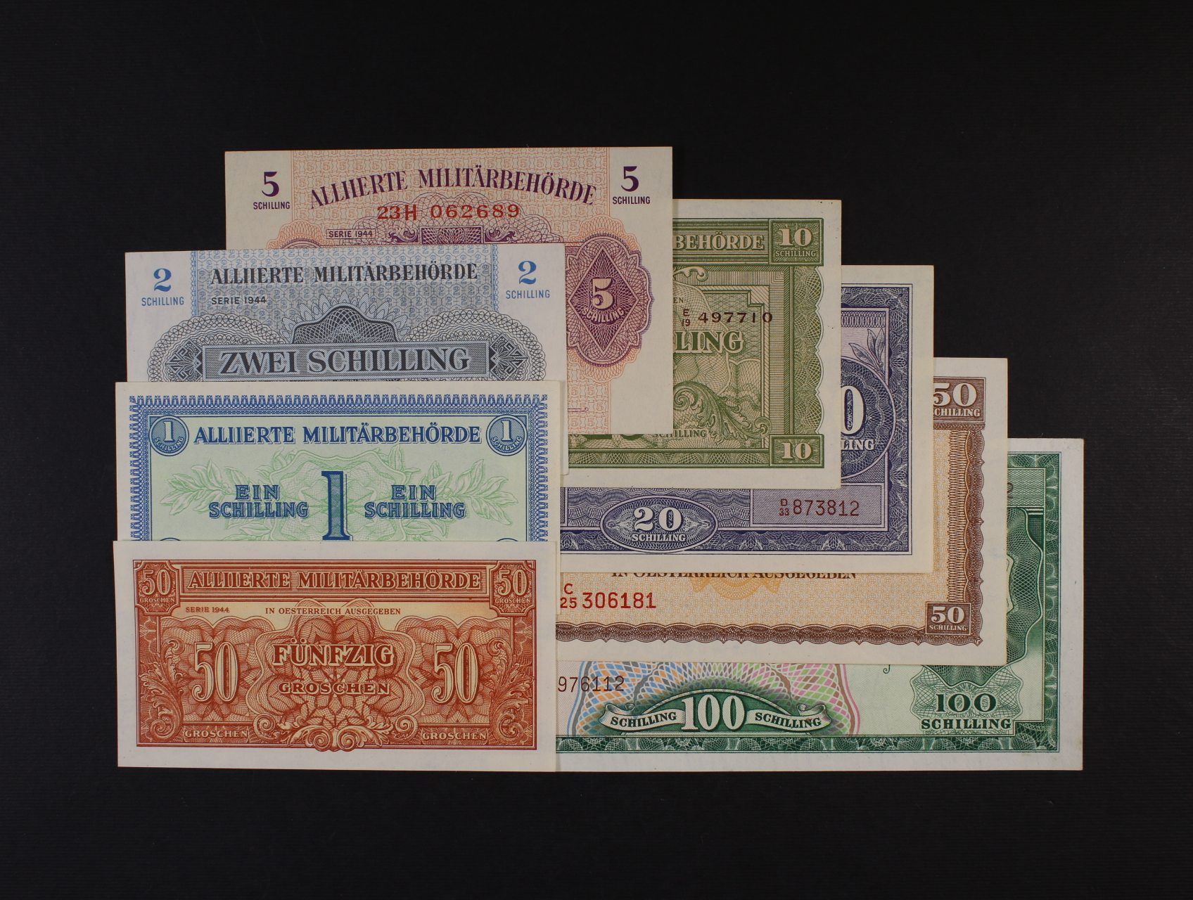 Alliierte, 0,50, 1, 2, 5, 10, 20, 50, 100 Schilling 1944, Ri. 253, 254, 255, 256, 257, 258, 260, 261a1, 8 kusů