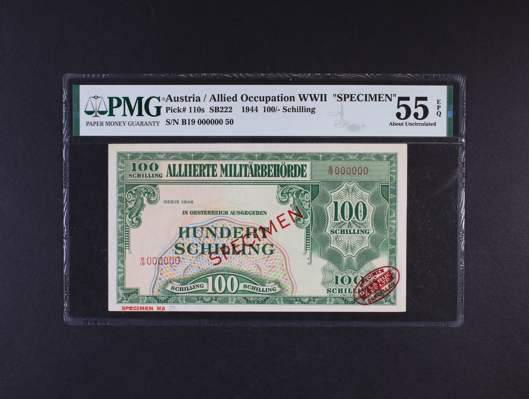 • Alliierte, 100 Schilling 1944 anulát, SPECIMEN No. 50, pečeť De La Rue, Ri. 261cb, Pi. 110s, PMG 55