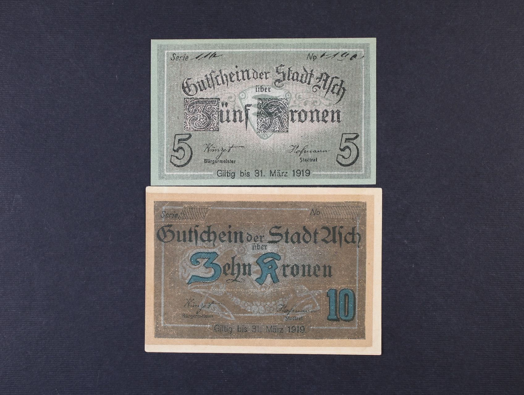 Asch (Aš), 5 K, 10 K 31.3.1919 město, H.H. 1.13.1a, 3f, 2 kusy