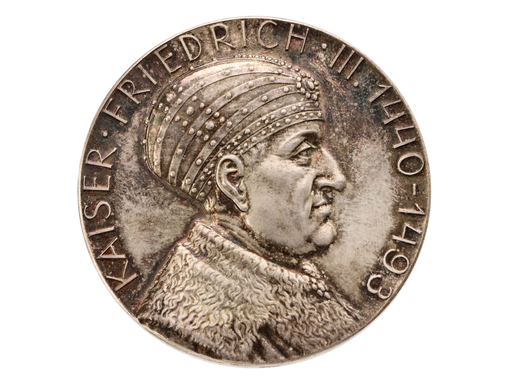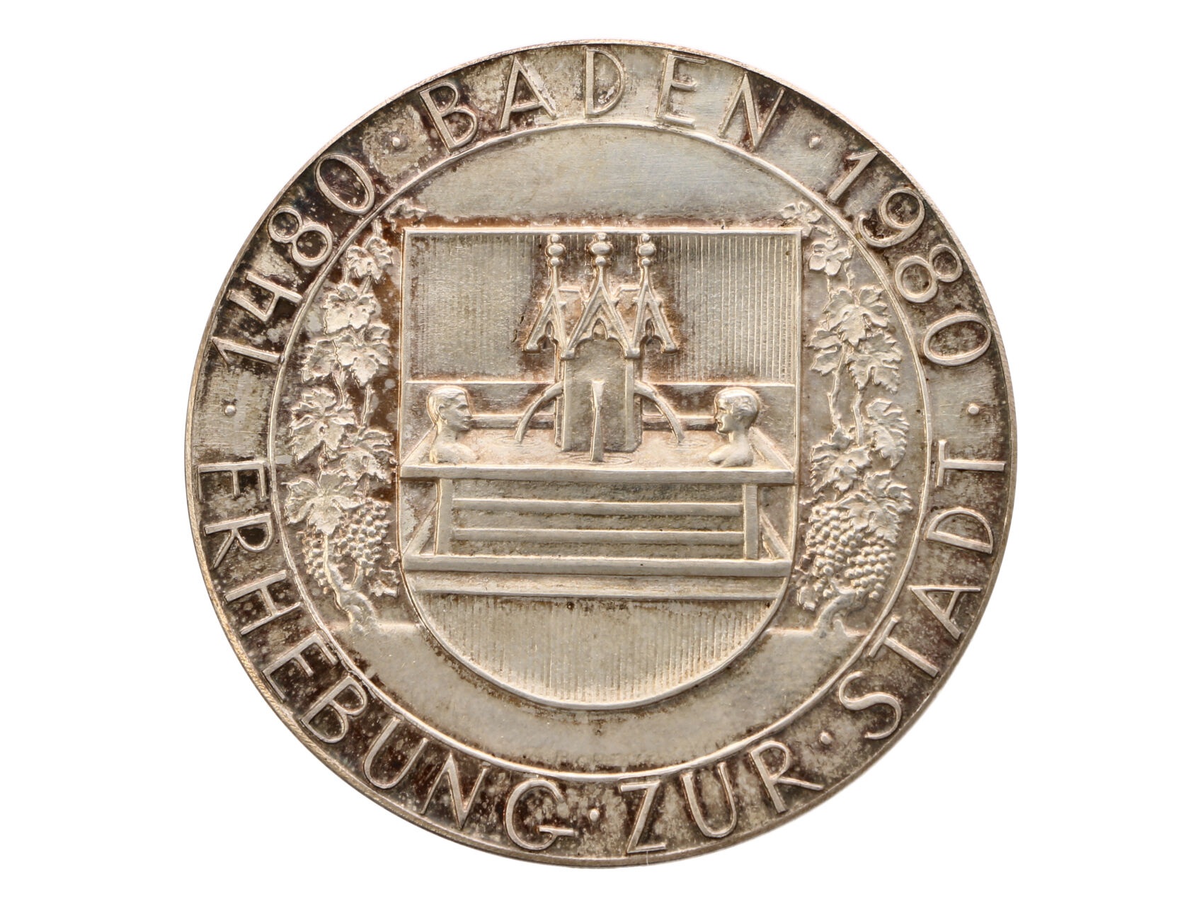 Baden - AR medaile 1980, 500 let povýšení na město, 1480 - 1980 Poprsí císaře Friedricha III., opis / městský znak, vinná réva, opis. Stříbro 41 mm, 31,98 g., nesignováno (Hartig Arnold), ne hraně značka hlavního puncovního úřadu Vídeň, A v kroužku a ryzostní značka 900