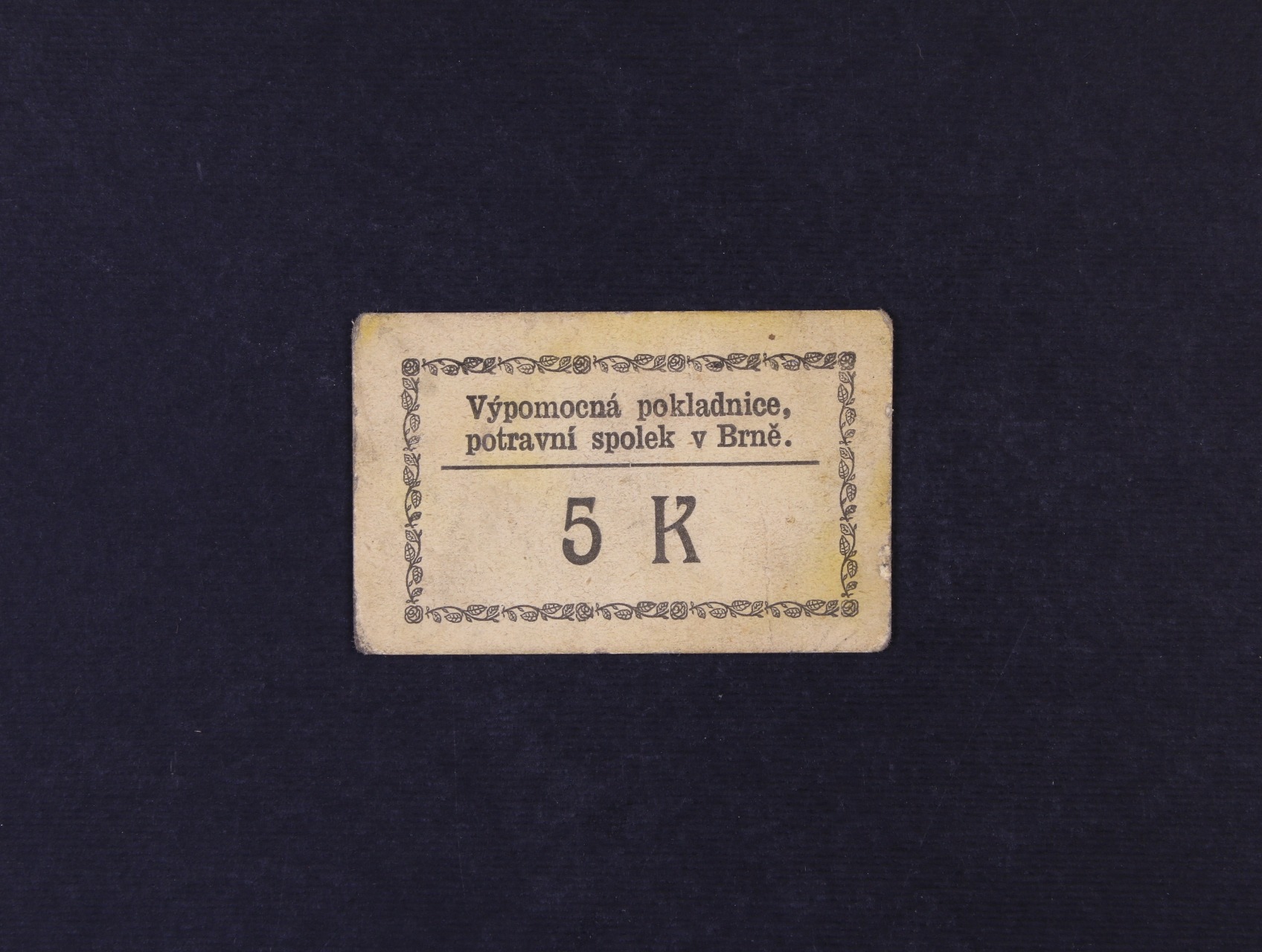• Brno, 5 K b.d. Výpomocná pokladnice, potravní spolek v Brně, na R oválné raz., H.H. 16.4.6c