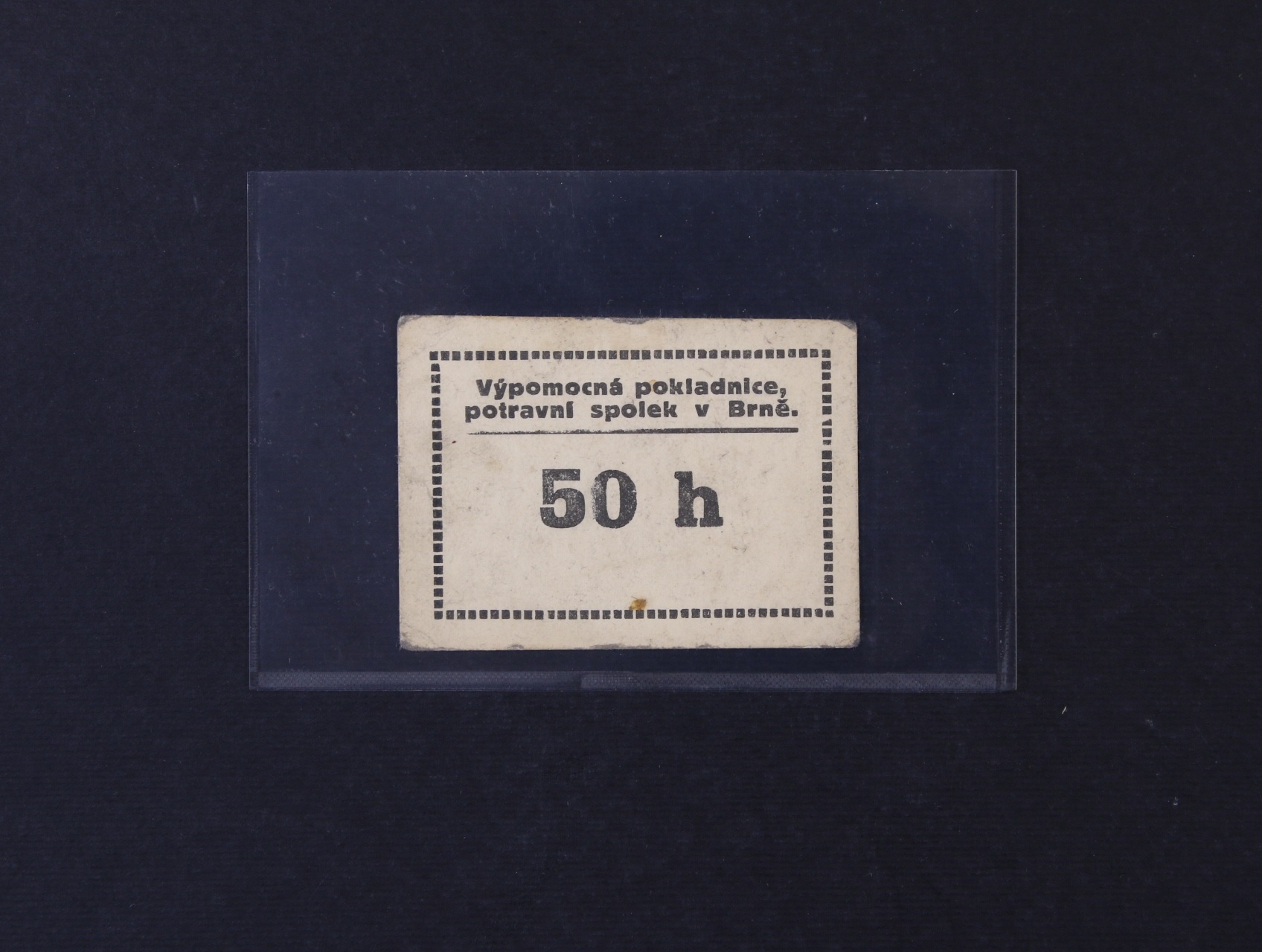 • Brno, 50 h b.d. Výpomocná pokladnice, potravní spolek v Brně, na R řádkové raz., H.H. 16.4.3d, známý jeden kus
