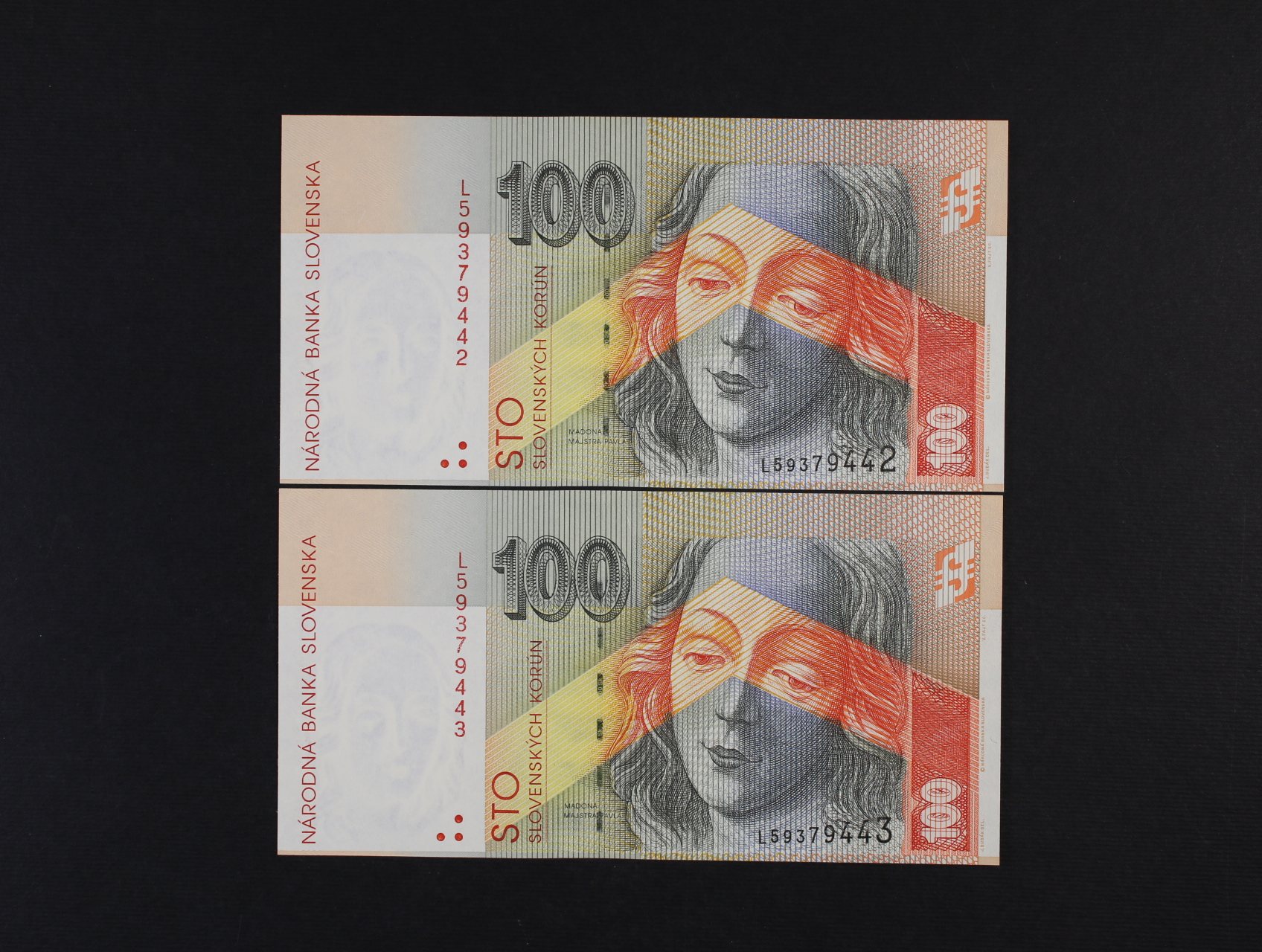 • chybotisk, 100 Sk 1.7.1999 série L s výrazným posunem ořezu směrem nahoru, 2 kusy s čísly po sobě, Ba. SK 25, Pi. 25c