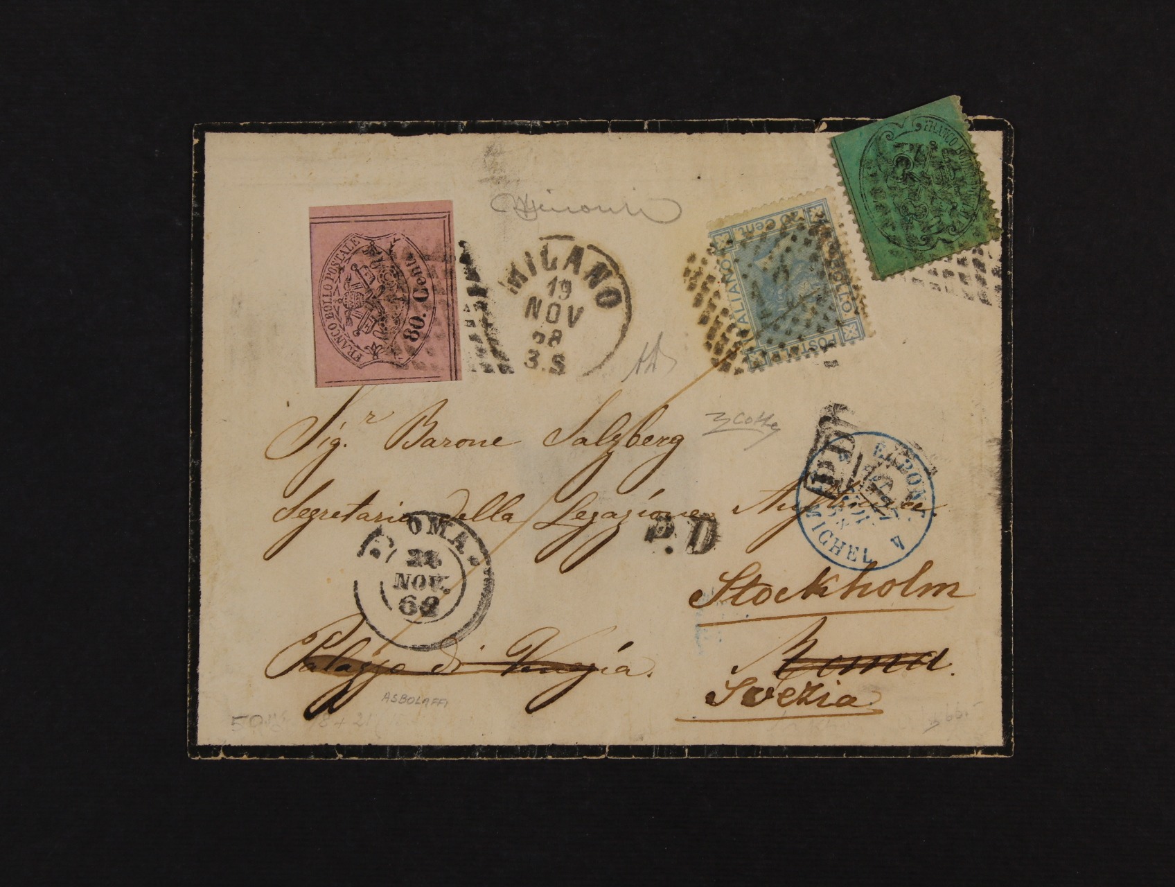 Církevní stát - unikátní skl. dopis odeslán z Milana 19.11.1868 do Říma, frank. zn. Italského království Sas. č. L 26, v Římě dofrank. zn. Církevního státu Sas. č. 20 a 25b, znehodnoc. němým kosočtvercovým raz. + DR ROMA 26.NOV.68 dosílaný do Stockholmu, přídavné rámeč. raz. a tranzitní modré raz., zk. A. Diena, Grioni, atest Giorgio Colla Asinelli, jedná se o jediný dosud známý dopis se smíš. frankaturou Ital. královsví + Církevního státu (uvedeno v atestu: UNIKÁT)