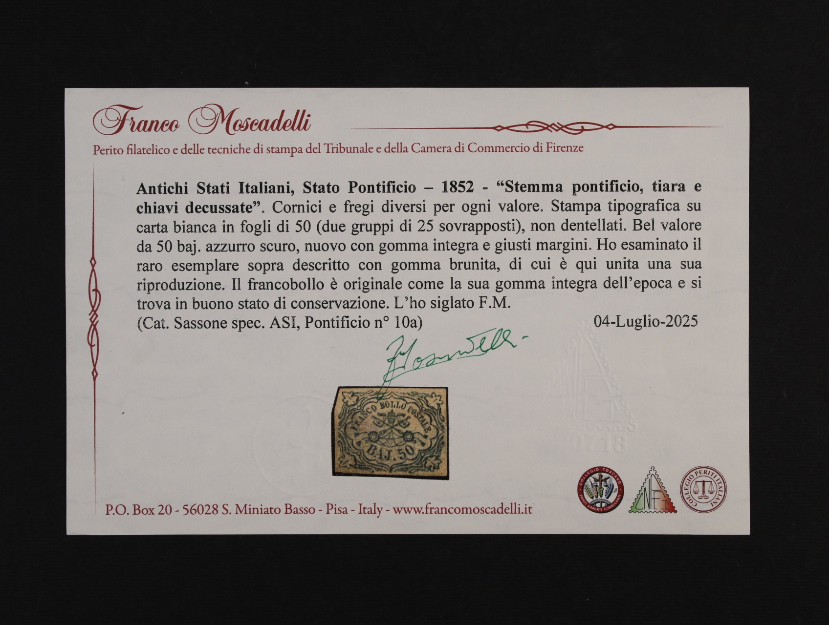 • Církevní stát - zn. Sas. č. 10a, zk. a atest Mosadeli, levý horní rožek nepatrně zastřižený, kat. Sas. 45000 EURO
