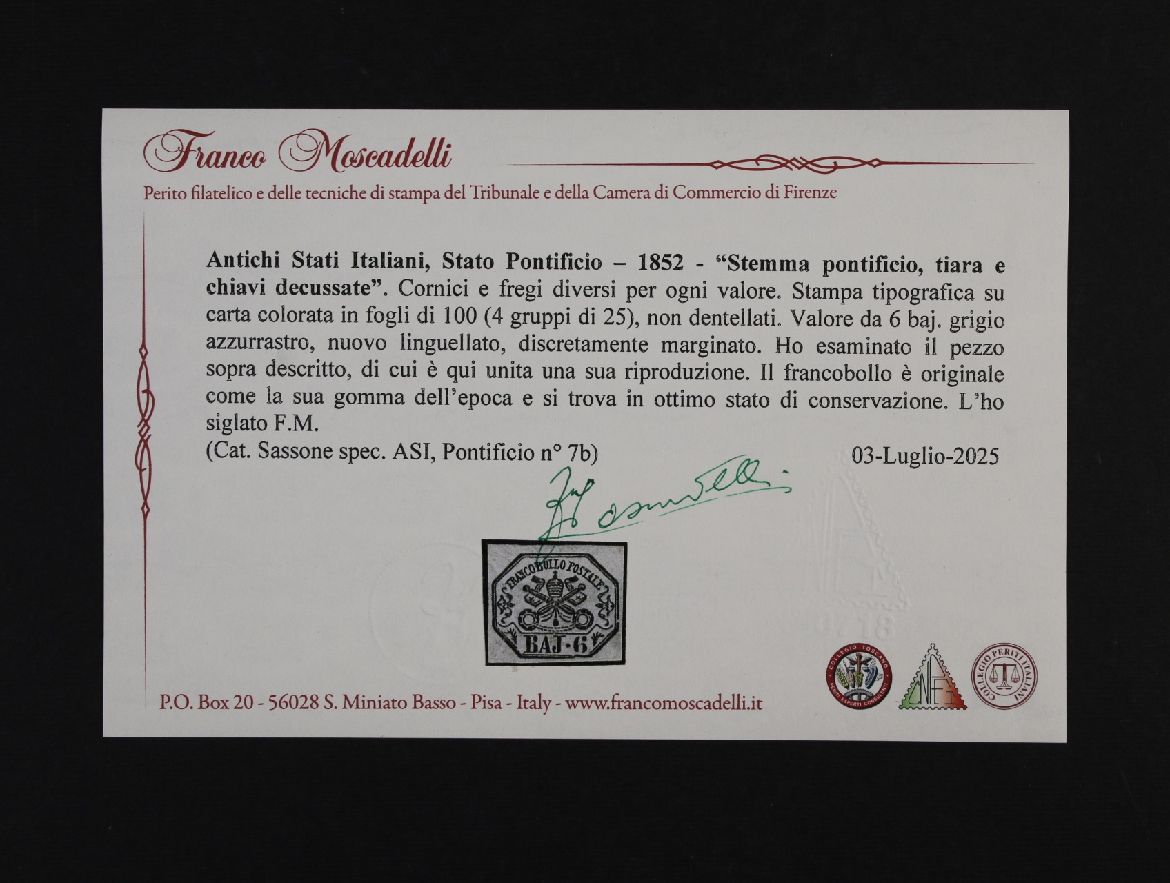 Církevní stát - zn. Sas. č. 7b, zk. a atest Mosadeli, kat. Sas. 3500 EUR