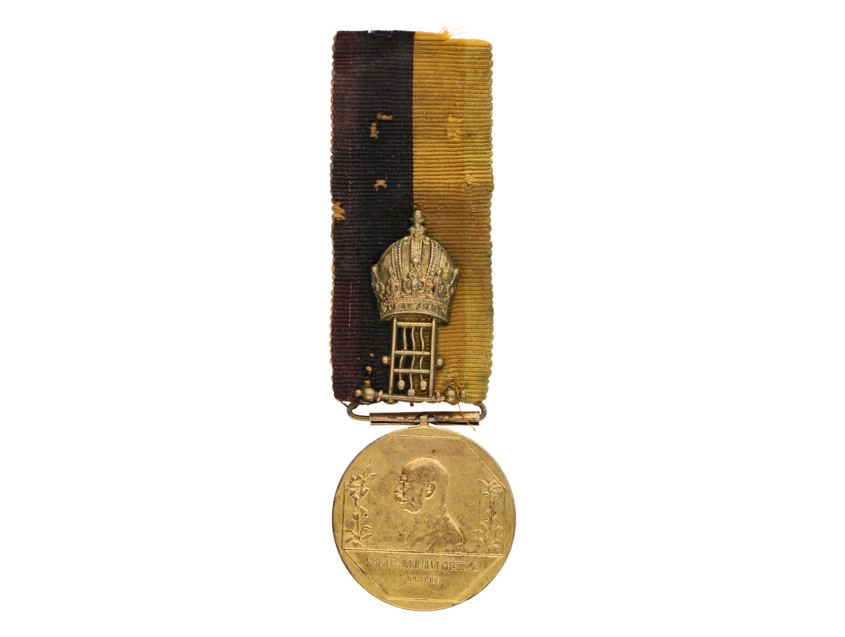 • Císařská jubilejní medaile na slavnostní průvod z roku 1908, s korunou na stuze, nepůvodní závěs
