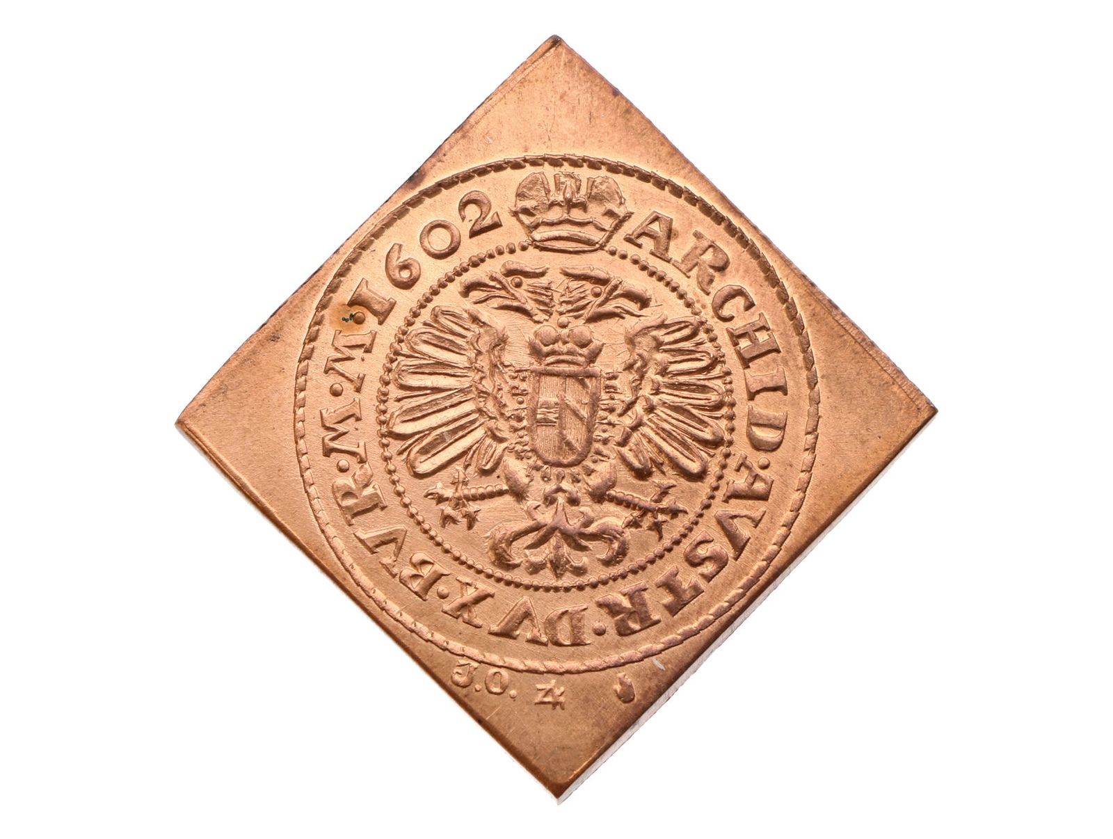 ČNS - pobočka v Brně - AE medaile 150. aukce pobočky, 2005. Napodobenina čtvrttolarové klipy Rudolfa II. pražské mincovny z r. 1602. Měď, 31x31 mm, 14,85 g., náklad 29 ks., signováno J.O., ZK a JJ (J.Jelínek, Z.Kaleta, J.Oplatek), F.A2/55d