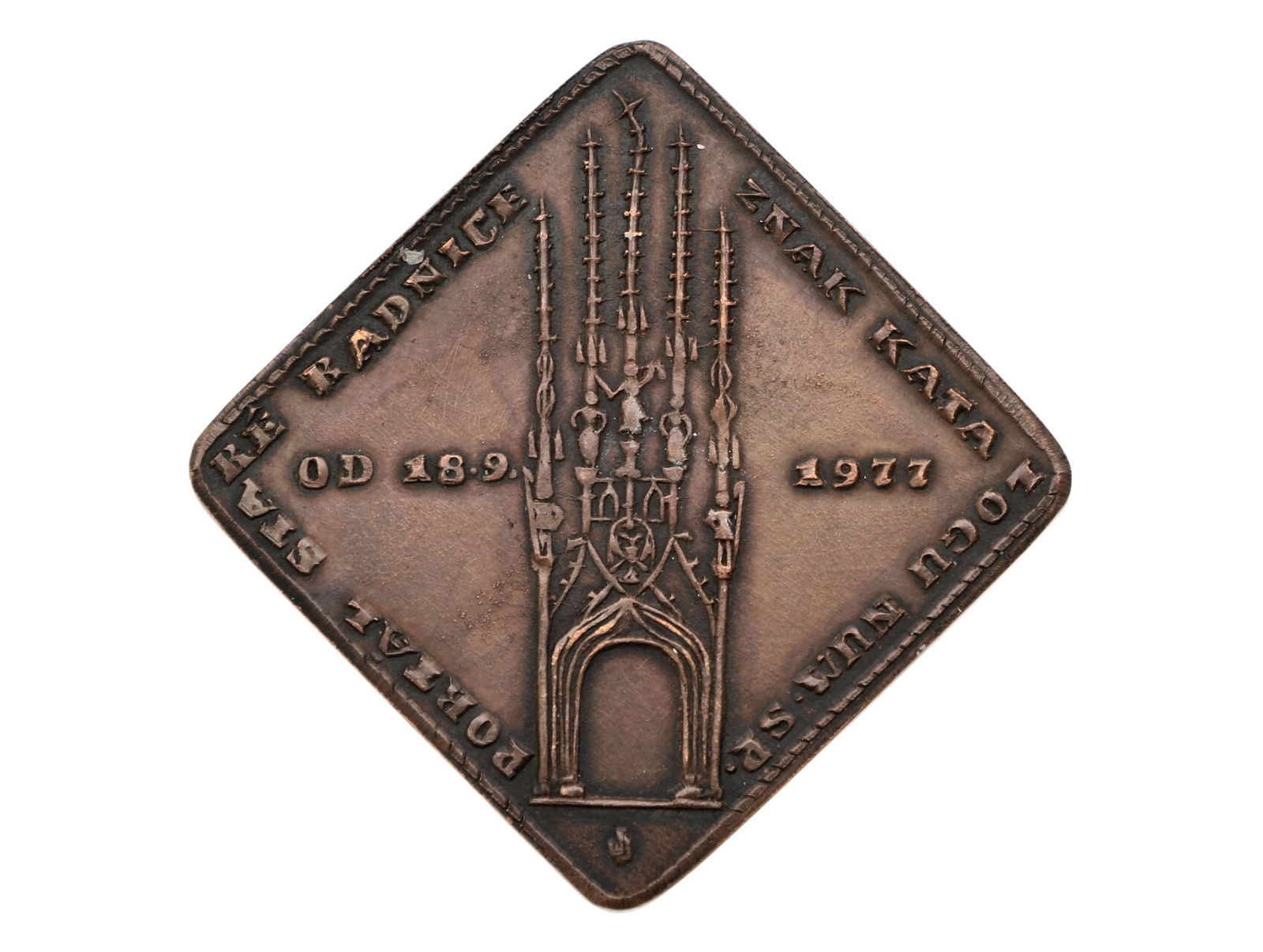 ČNS - pobočka v Brně - AE medaile 150. aukce pobočky, 2005. Uprostřed šachovaná moravská orlice, po stranách ozdoby, text / vchodový portál brněnské radnice uprostřed, text. Trimetal 29,5x29,5 mm, 13,73 g., signováno JJ (J.Jelínek), náklad 41 ks., F.A2/56a