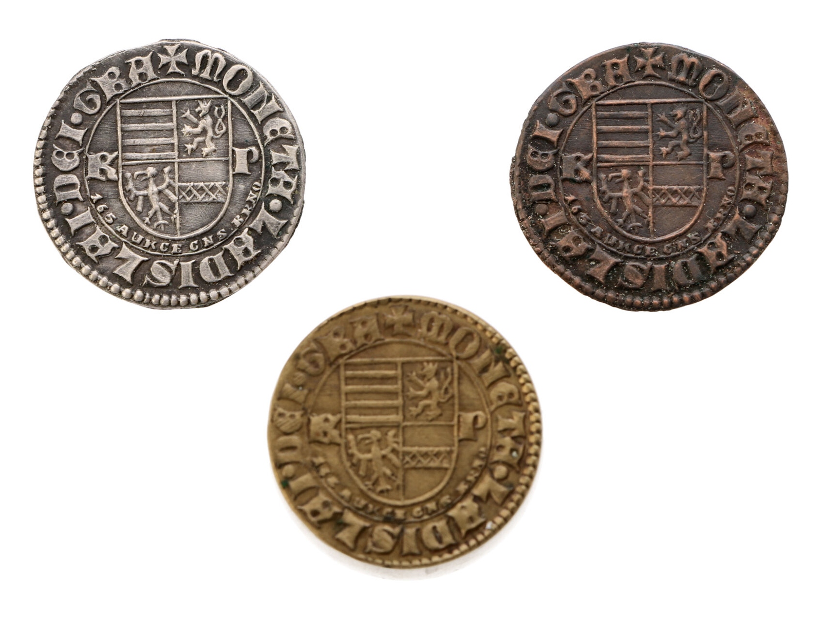ČNS - pobočka v Brně - AR/AE medaile 165. aukce pobočky, 2013. Napodobenina kremnického dukátu Ladislava Pohrobka s moravskou orlicí, ražený za správce Horních Uher Jana Jiskry z Brandýsa 1446-1453. Stříbro 0.999, 19 mm, 1,64 g., náklad 115 ks., k tomu měd, 1,12 g., náklad 115 ks., a mosaz 18,33 g., náklad 38 ks., signováno JJ (J.Jelínek), F.A2/76b,c,d, celkem 3 kusy