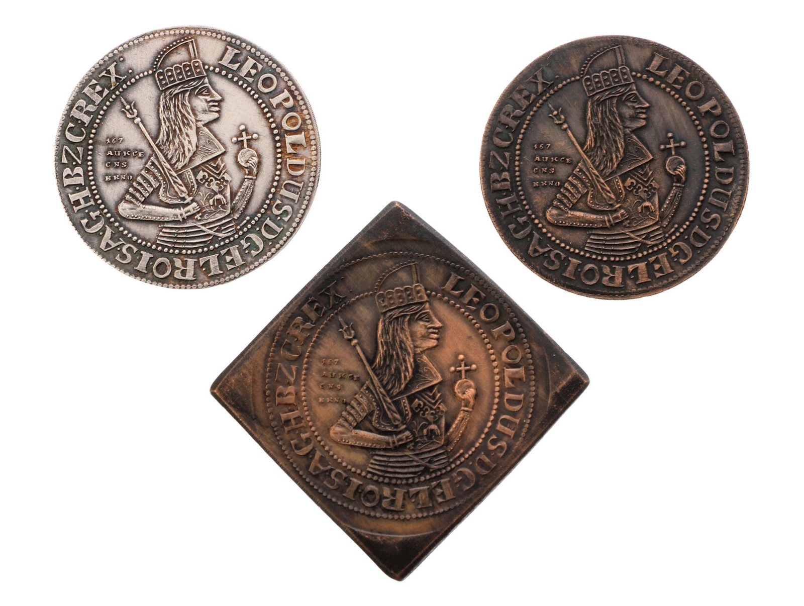 ČNS - pobočka v Brně - AR/AE medaile 167. aukce pobočky, 2014. Napodobenina křížené ražby Ferdinanda III. a Leopolda I. z vratislavské mincovny. Stříbro 0.999, 36 mm, 8,88 g., náklad 72 ks., k tomu 2x měď, 36 mm, 17,11 g., náklad 60 ks. a 38x38 mm, 54,50 g., náklad 40 ks., signováno JJ (J.Jelínek), F.A2/80b,d,e, celkem 3 kusy