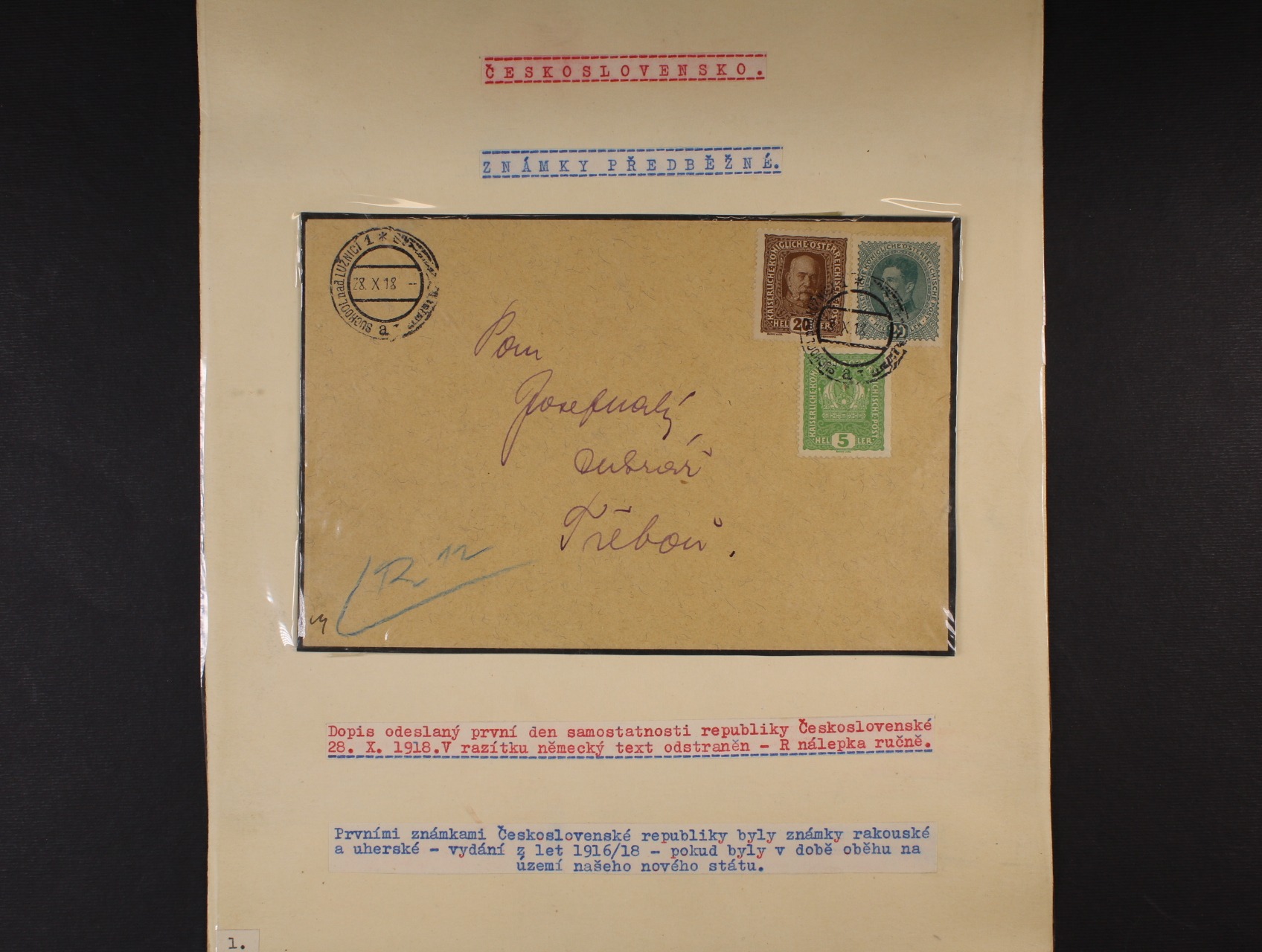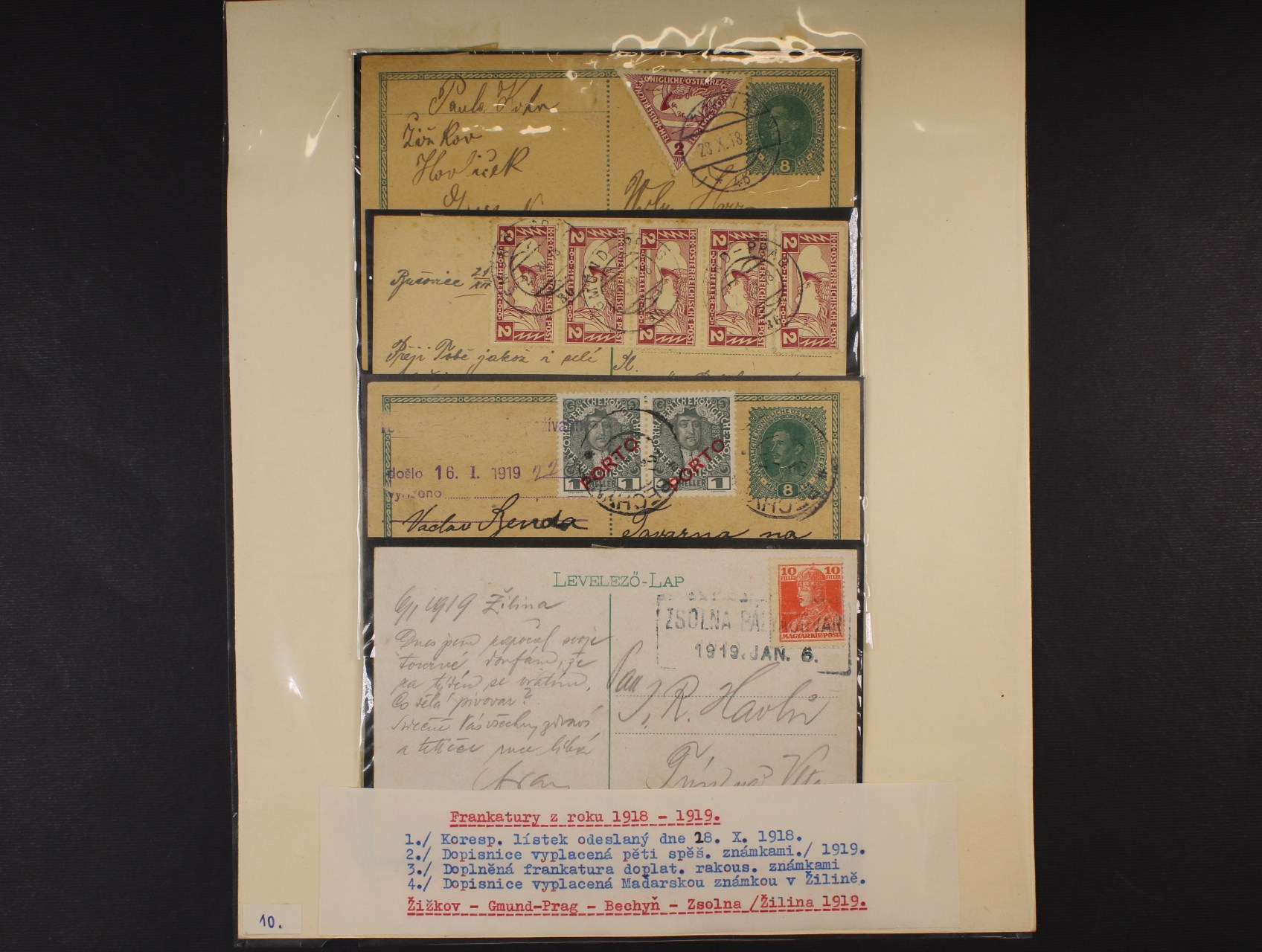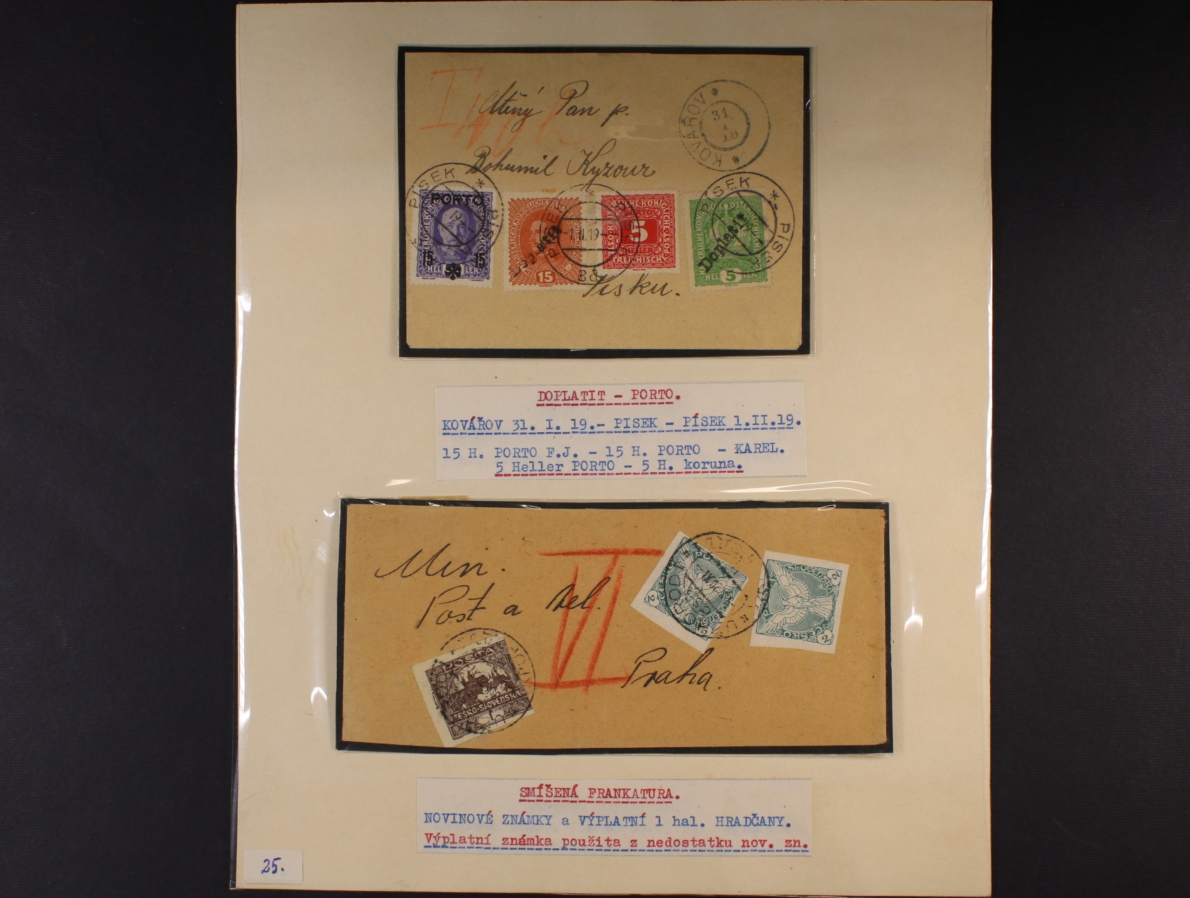 ČSR I - malá sbírka 25 ks celistvostí a výstřižků frank. předběžnými a souběžnými zn., zajímavé frankatury a raz., pochází z pozůstalosti významného čs. sběratele Zajíčka, uloženo v krabici