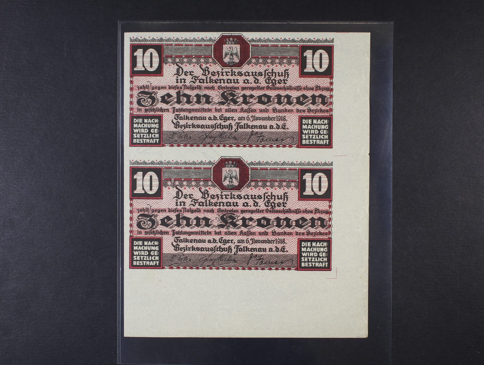 • Falkenau a. d. Eger (Falknov nad Oří), 10 K 6.11.1918 Okres bez série a čísla, bez průsvitky, ve svislé dvoupásce, H.H. 46.1.4a