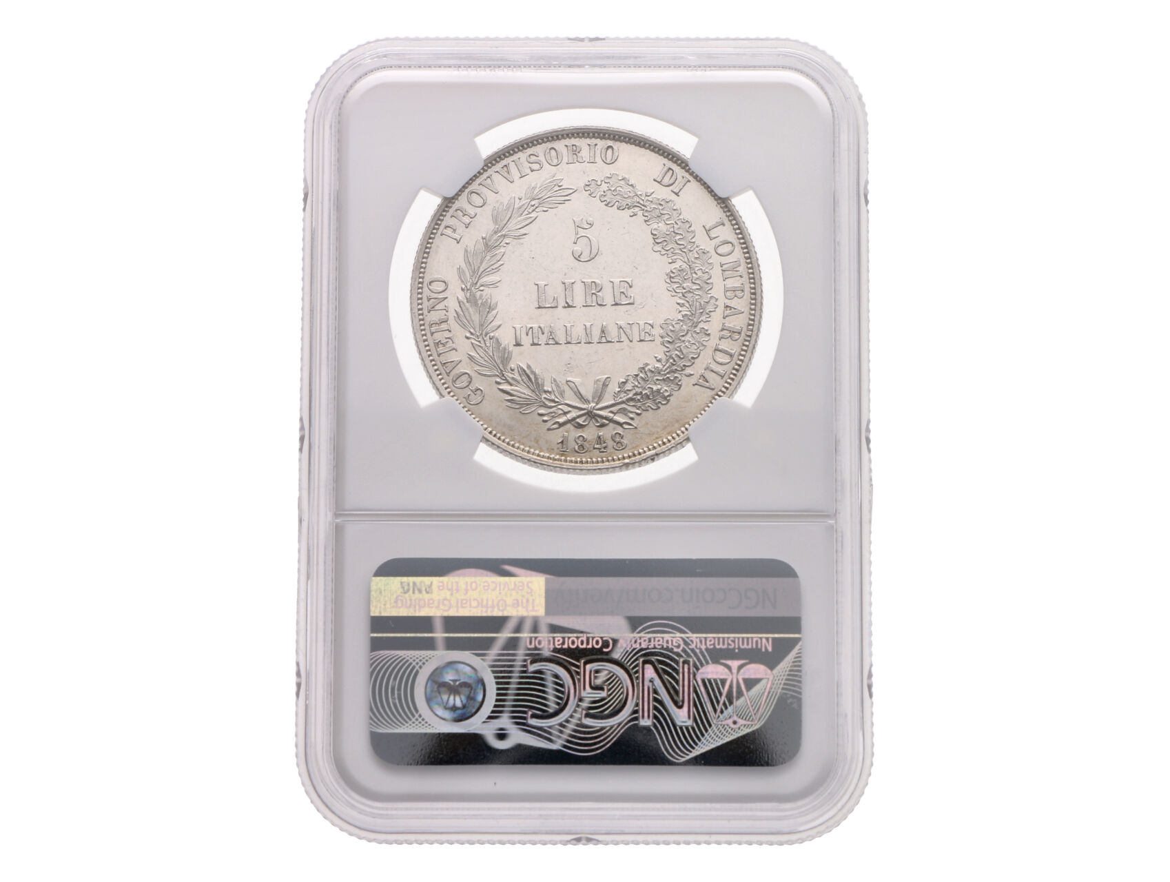 Ferdinand V. 1835-1848 - 5 Lire 1848 M varianta - delší konce ratolestí, hvězda nad korunou blízko, NGC 61
