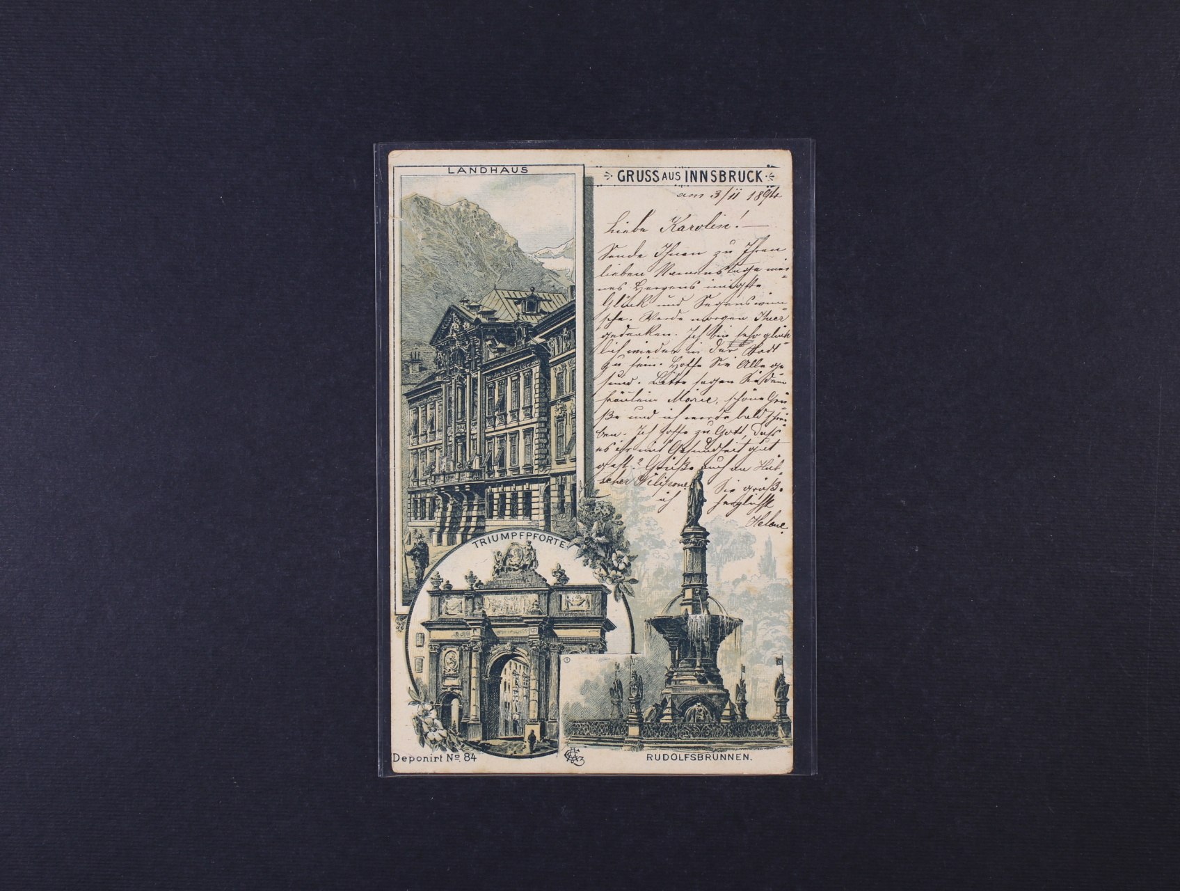 • Insbruck - bar. litograf. koláž, dl. adresa, použitá 1894, zajímavé, vzácné