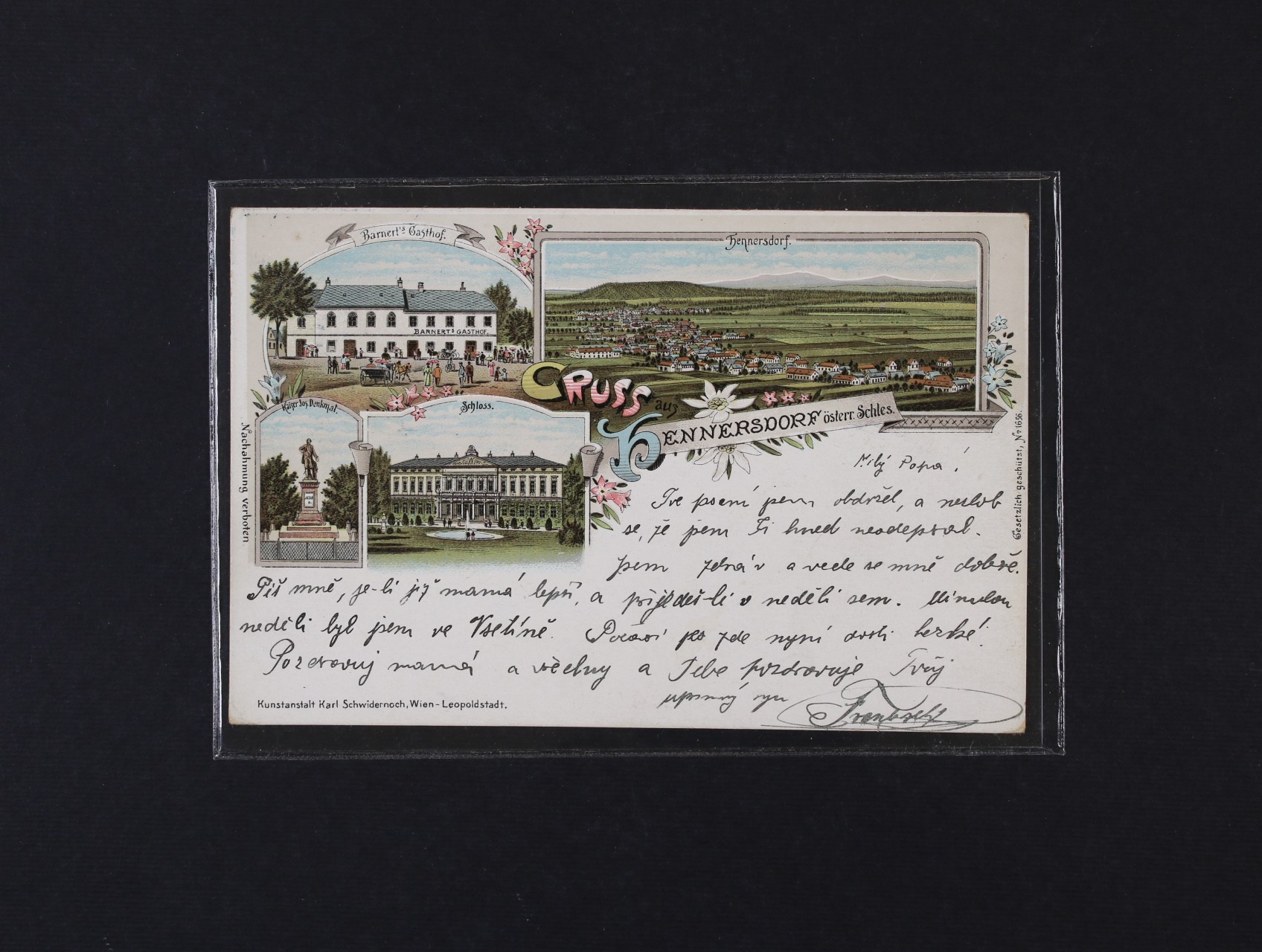 • Jindřichov, okr. Bruntál - bar. litograf. koláž Schwidernoch, použitá 1898, velmi dobrá kvalita