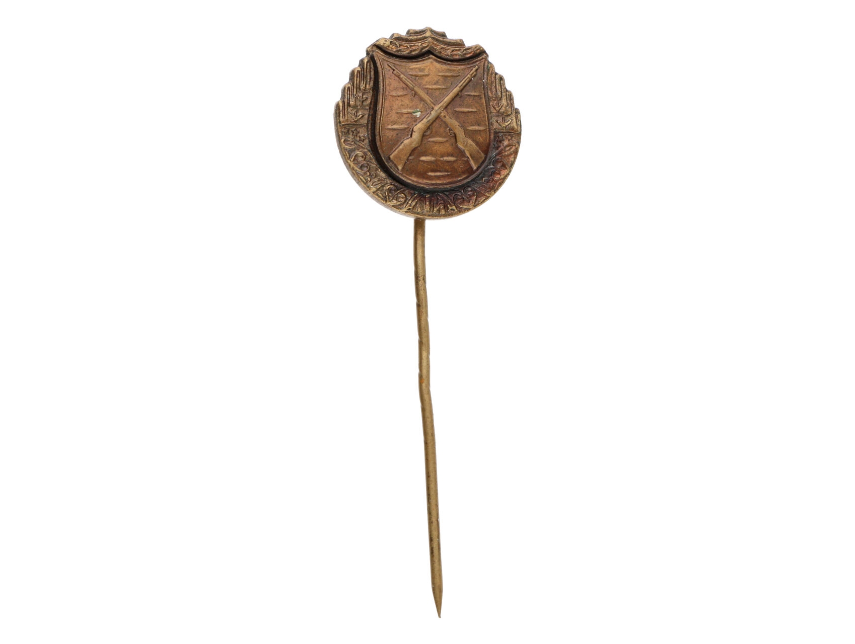 Miniatura výkonnostního odznaku pro střelce z pušky, na reversu značka lev ve štítě, upínání na svislou jehlu