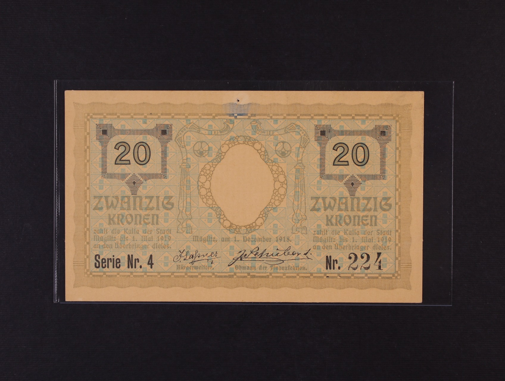 • Müglitz (Mohelnice), 20 K 1.12.1918 Stadt, H.H. 140.1.4b, dírka po špendlíku