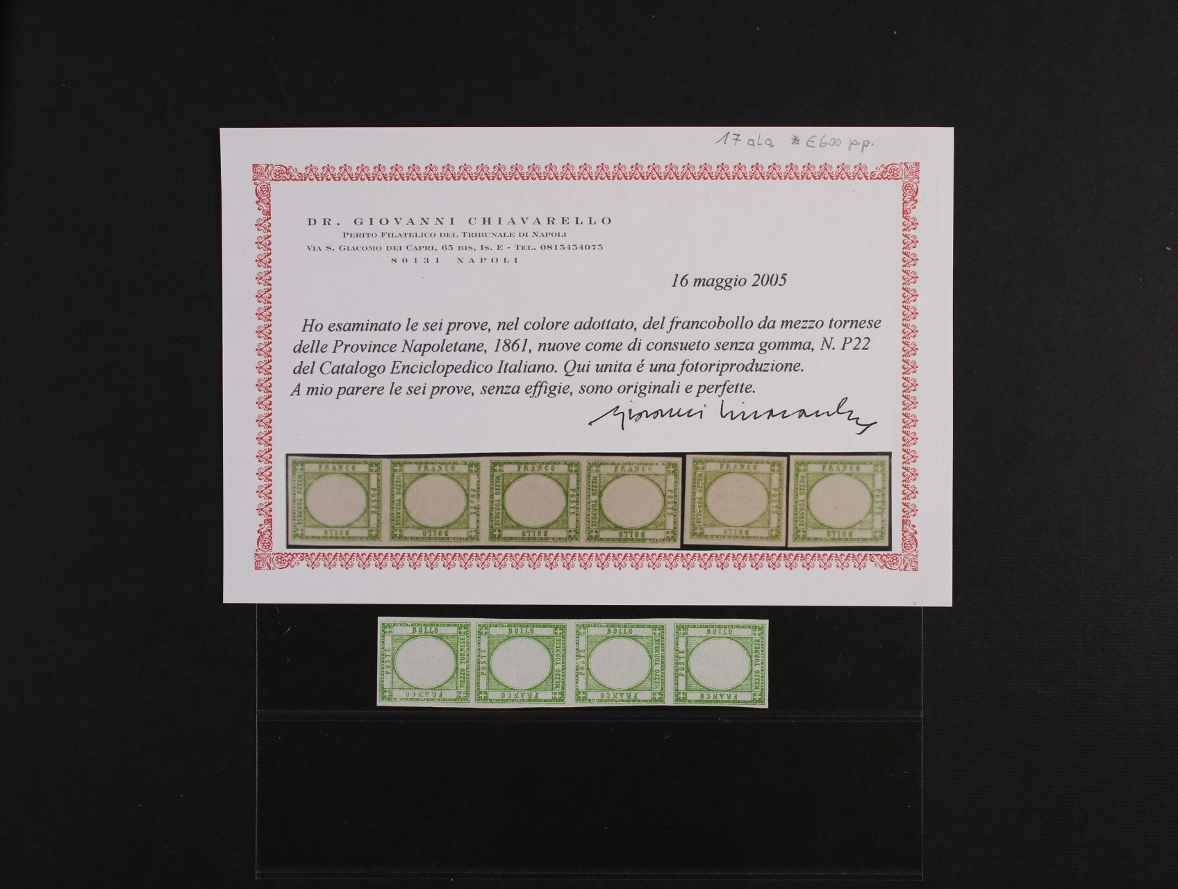 Neapol 1861 - zn. Sass. č. 17ala, 4-páska Viktor Emanuel II. 1/2 Tornesse světle zelená, vše chybotisky BEZ HLAVY; bezvadné, atest Chiavarello, kat. 2.400 EUR