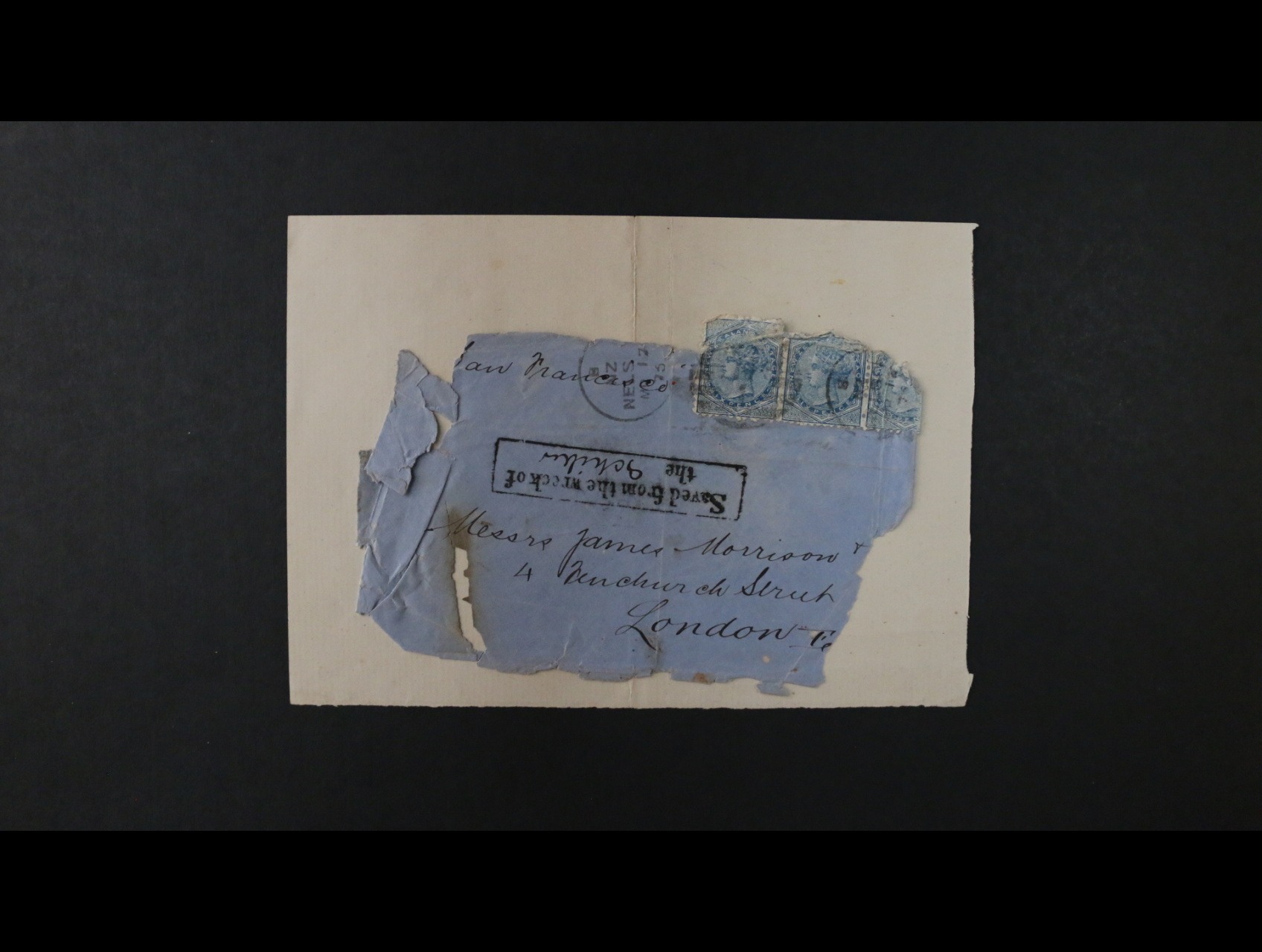Nový Zéland 1875 katastrofická pošta - fragment dopisu přes San Francisko do Londýna, vyzvednutý z vraku lodi, denní raz. NZ NELS MR.17.1875 + rámeč. raz. Saved from the vreck of the, s ručně dopsaným názvem lodi Schiller , velmi zajímavé, vzácné