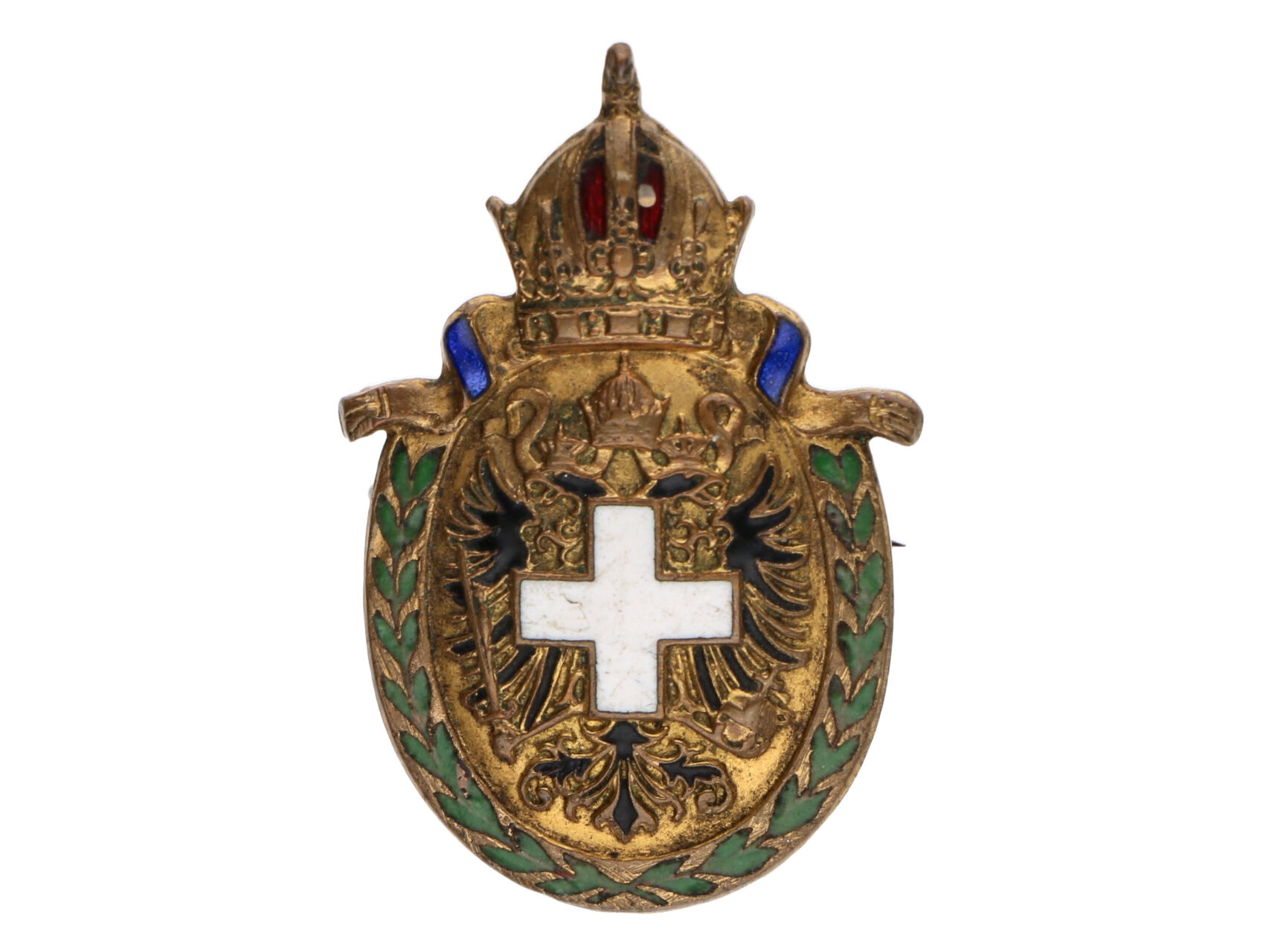 • Odznak společnosti bílého kříže, ve prospěch vězňů, dvouhlavý císařský orel, bílý kříž, zapínání na vodorovnou jehlu, pozlacený bronz, smalty