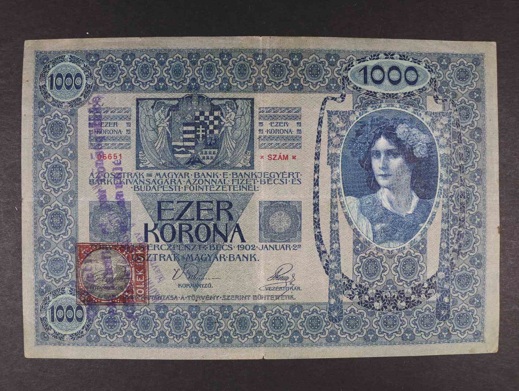 • padělek, 1000 K 2.1.1902 kolkovaná falešným tištěným kolkem s raz. Ce Timbre ... + BÚMF, Ba. 6, Pi. 5,, var. přetisku Da. 10 + 2.