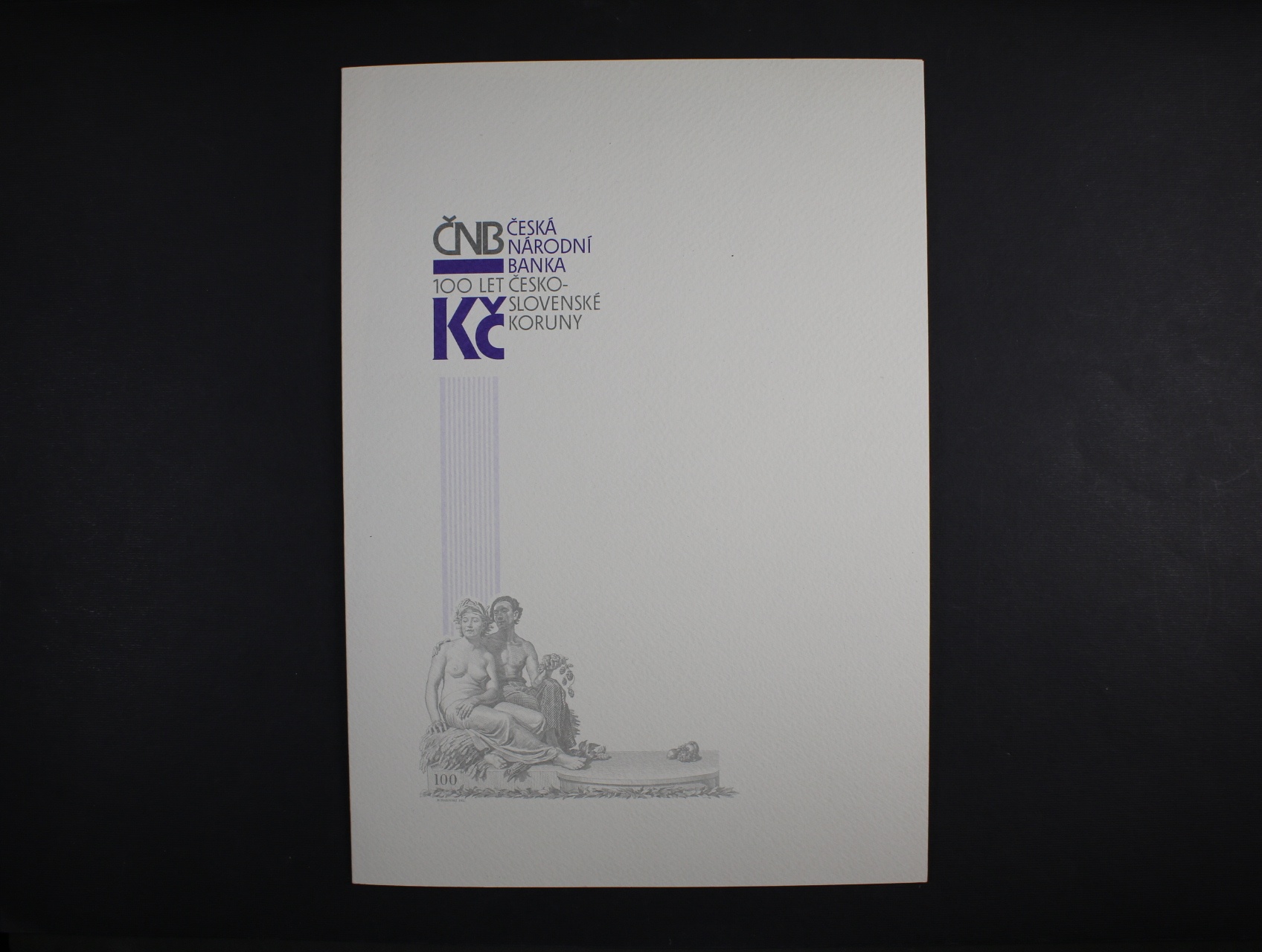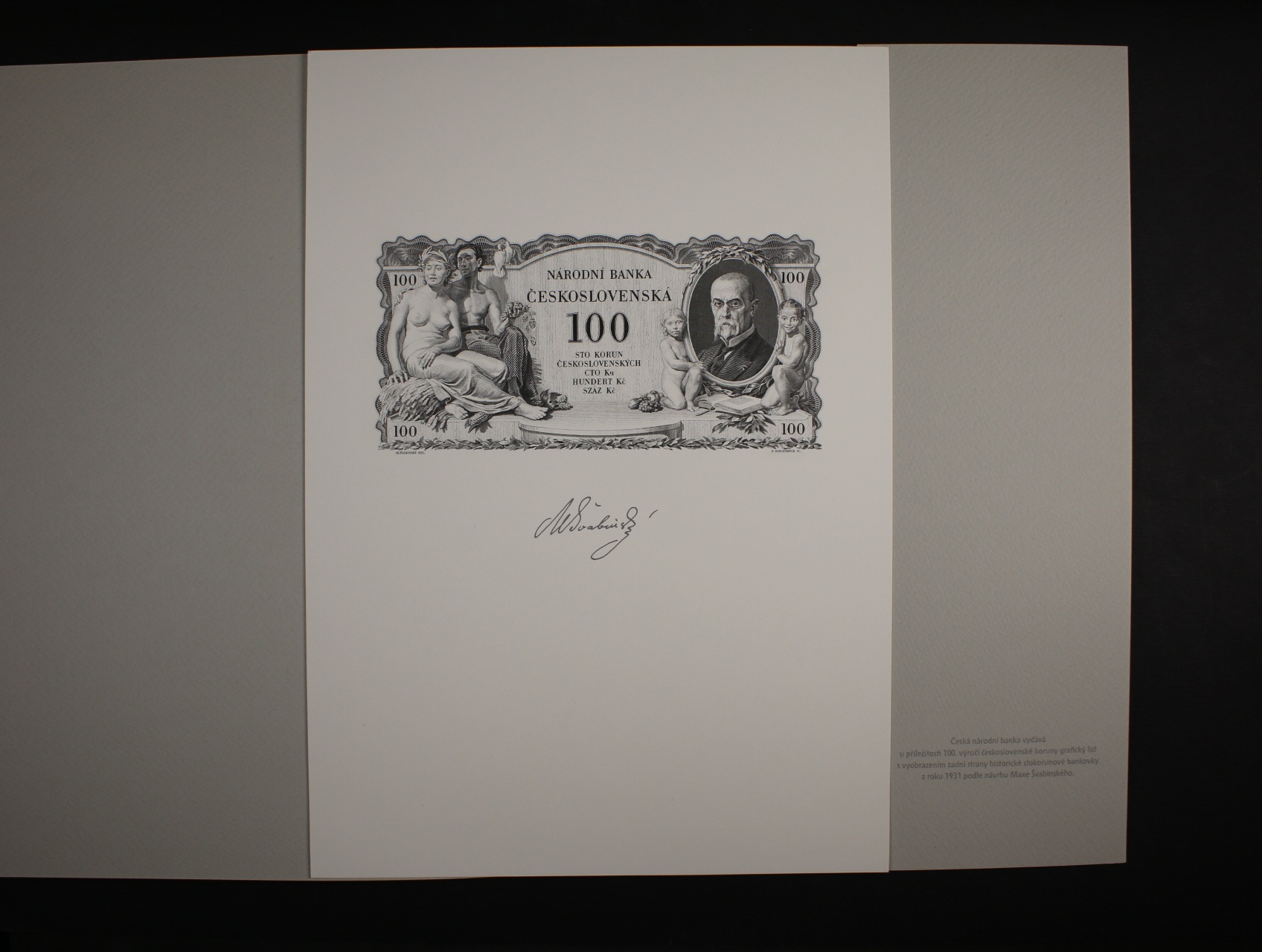 • paměrní risk ČNB, 100 Kč 1931, hlubotiskový nátisk rubu na kartonu A4, grafický list u příležitosti 100.výročí československé koruny, dárkový obal
