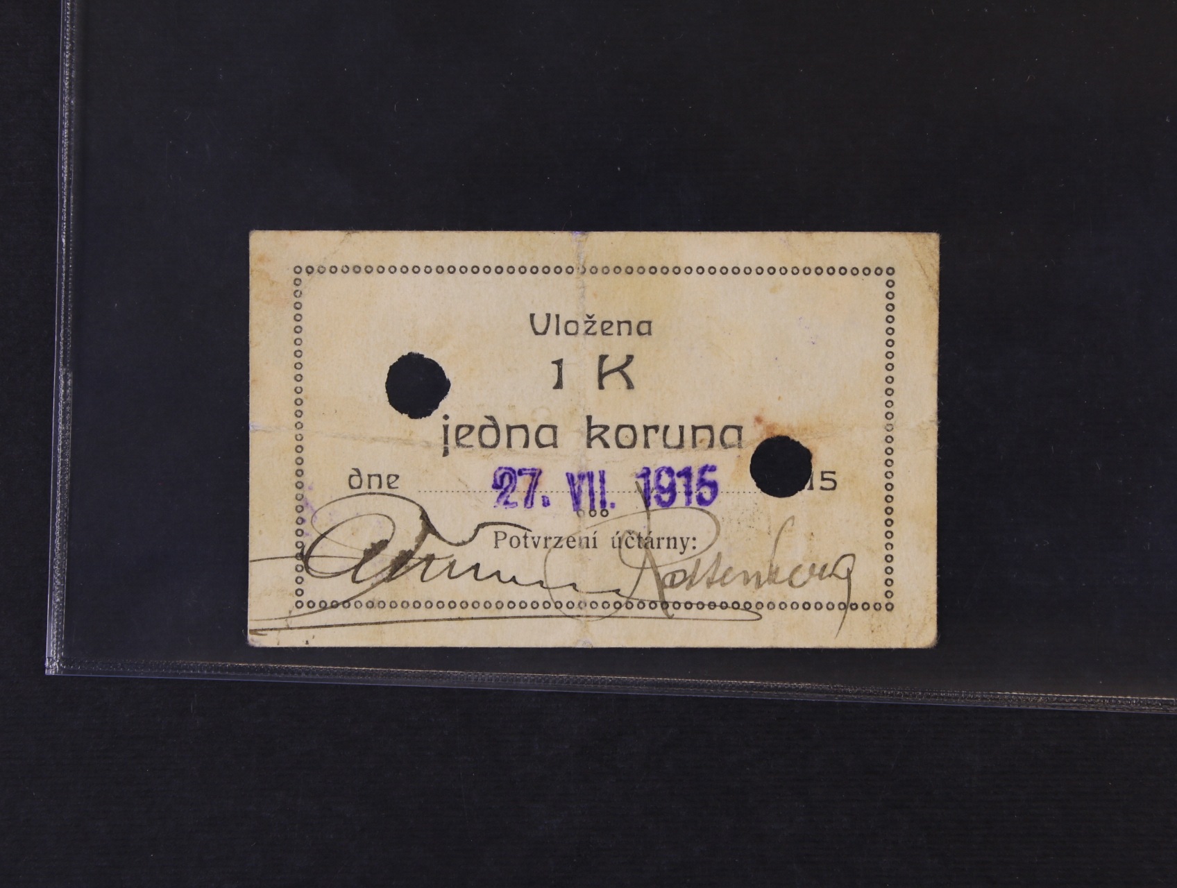 • Pelhřimov, 1 K s raz. 27.VII.1915 Spořitelna města, raz., 2x perforační otvor, H.H. 172.2.2a3