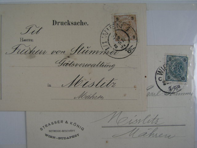 Perfiny Rakousko - dve firemni celistvosti z r. 1904 s identifikacnim perfinem SH&SH, resp. ST&K, lux. kvalita