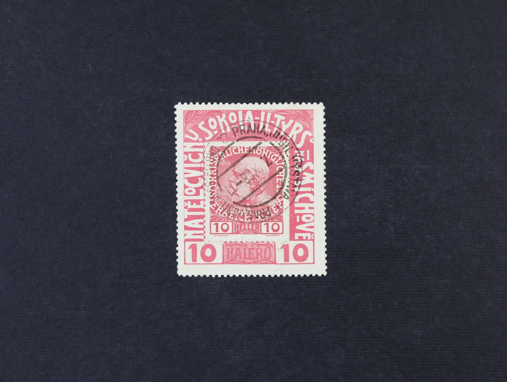 • Praha, 10 h 1908 Na tělocvičnu sokola II.Tyrš na Smíchově s nalepenou poštovní známkou 10 h s raz. Jubilejní výstavy v Praze 7.9.1908, zoubkovaná