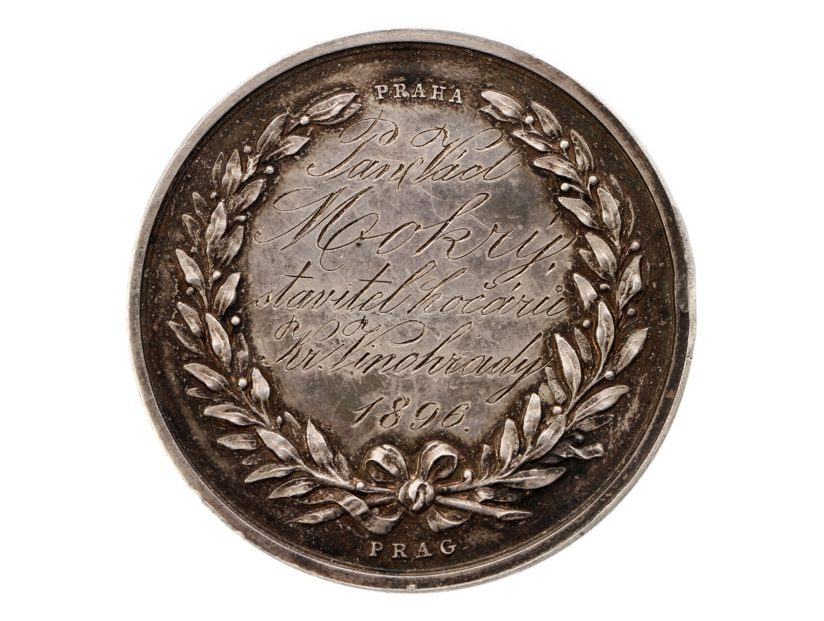 Praha - AR Medaile Průmyslová jednota v Čechách, na R věnování Václav Mokrý, stavitel kočárů Vinohrady 1896, 41,4g, 40 mm